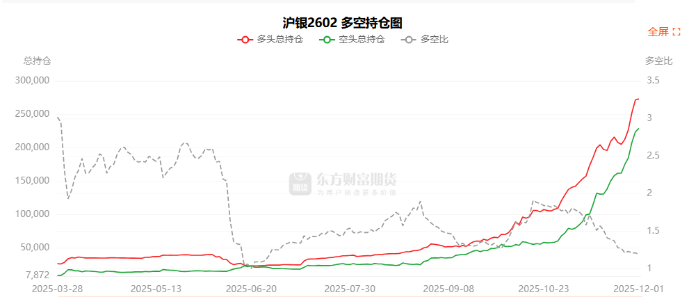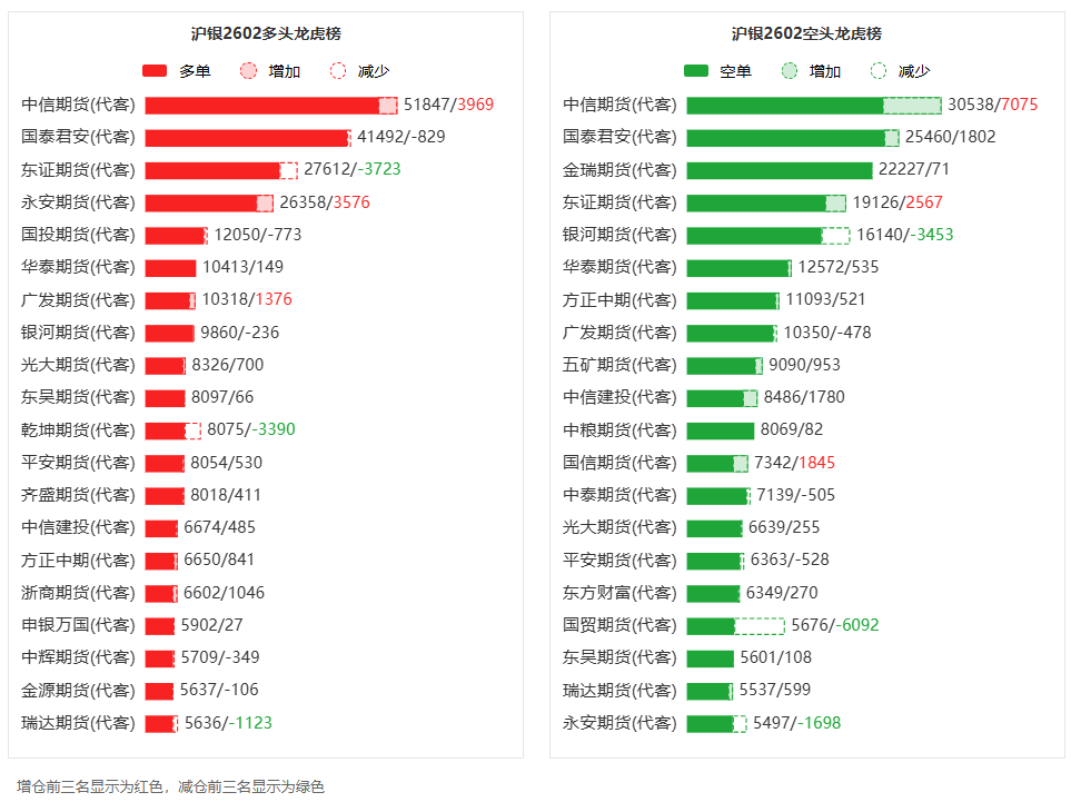 总体而言,沪银2602合约今日增仓上行,多空持仓排名前20席中,多空双方均呈进场态势,多头进场意愿弱于空头。