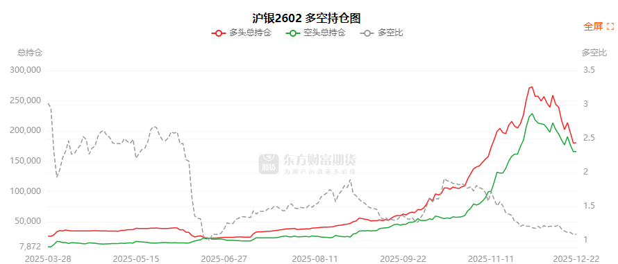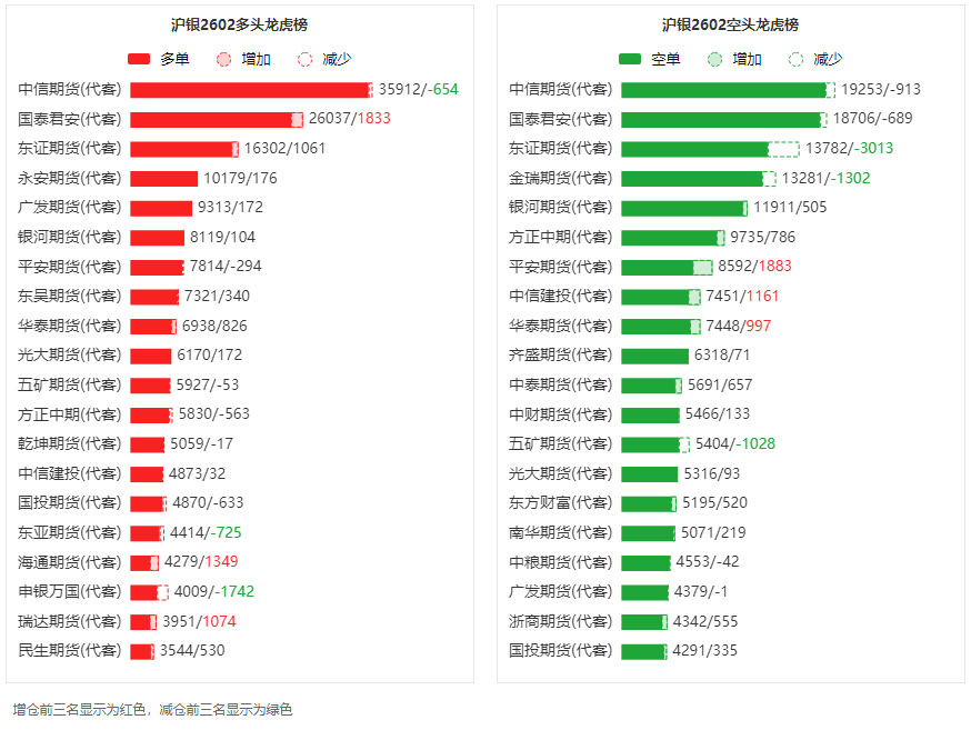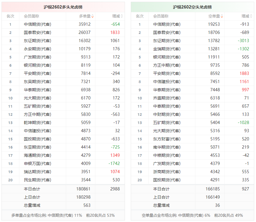 总体而言,沪银2602合约今日增仓上行,多空持仓排名前20席中,多空双方均呈进场态势,多头进场意愿强于空头。