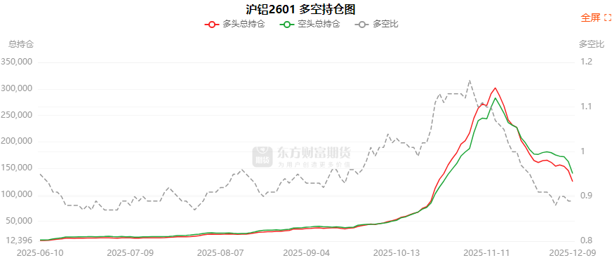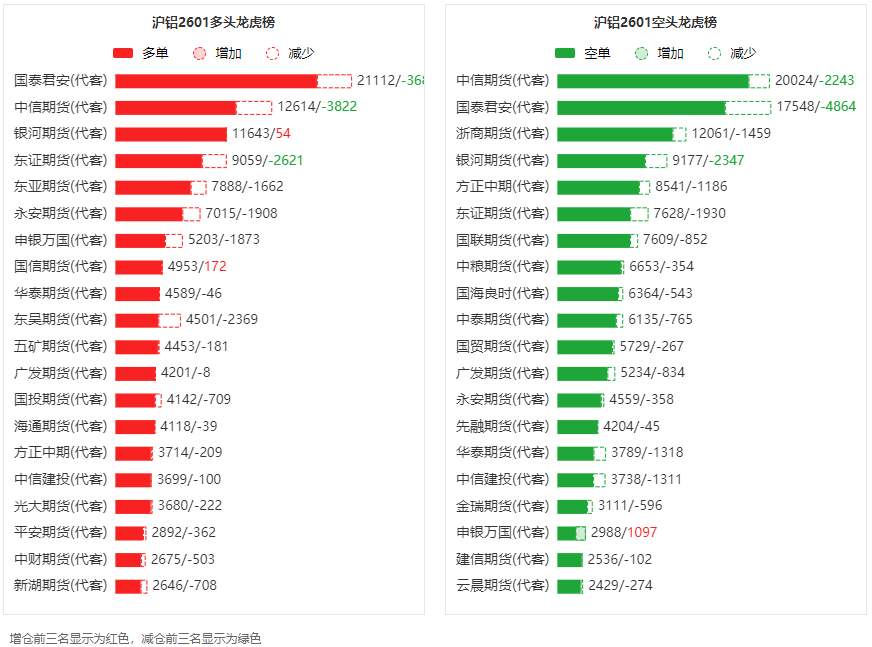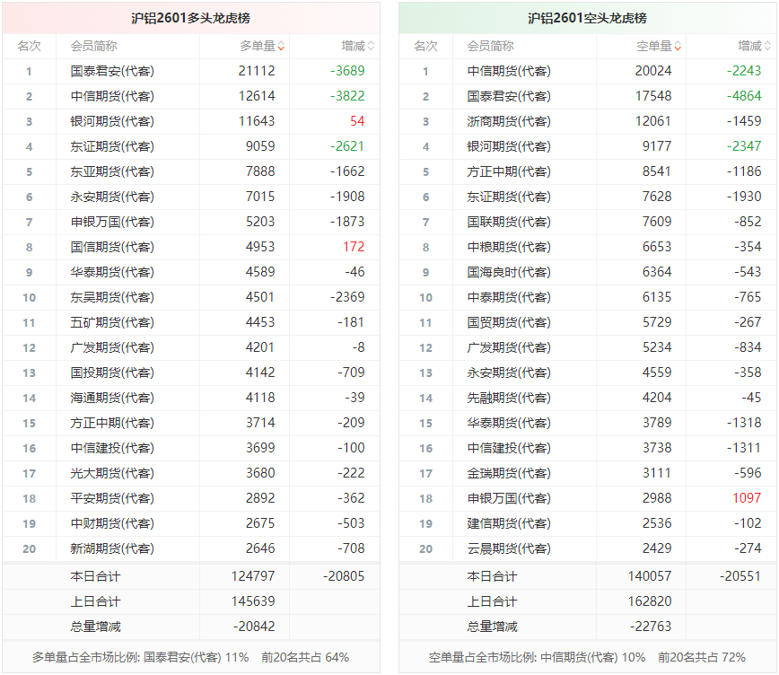 总体而言,沪铝2601合约今日减仓下行,多空持仓排名前20席中,多空双方均呈退场态势,多头退场意愿弱于空头。
