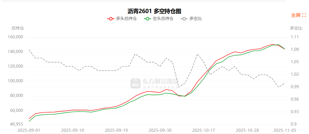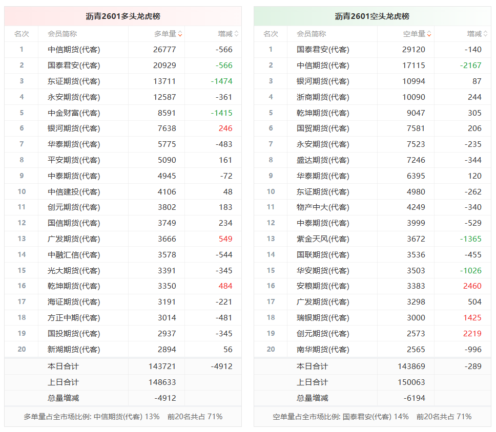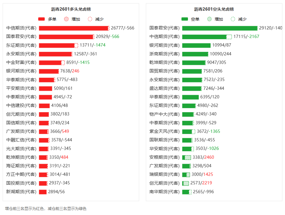 总体而言,沥青2601合约今日减仓下行,多空持仓排名前20席中,多空双方均呈退场态势,多头退场意愿弱于空头。