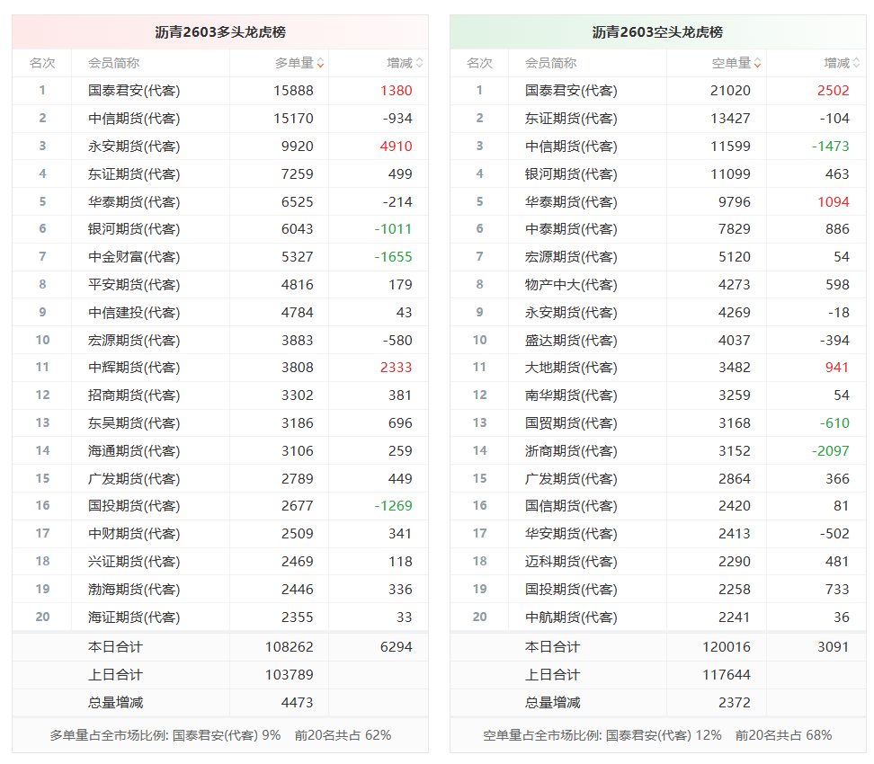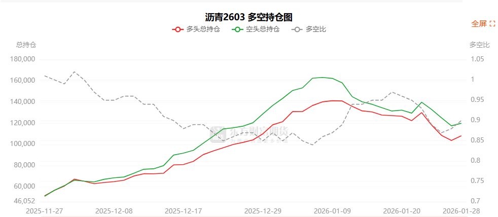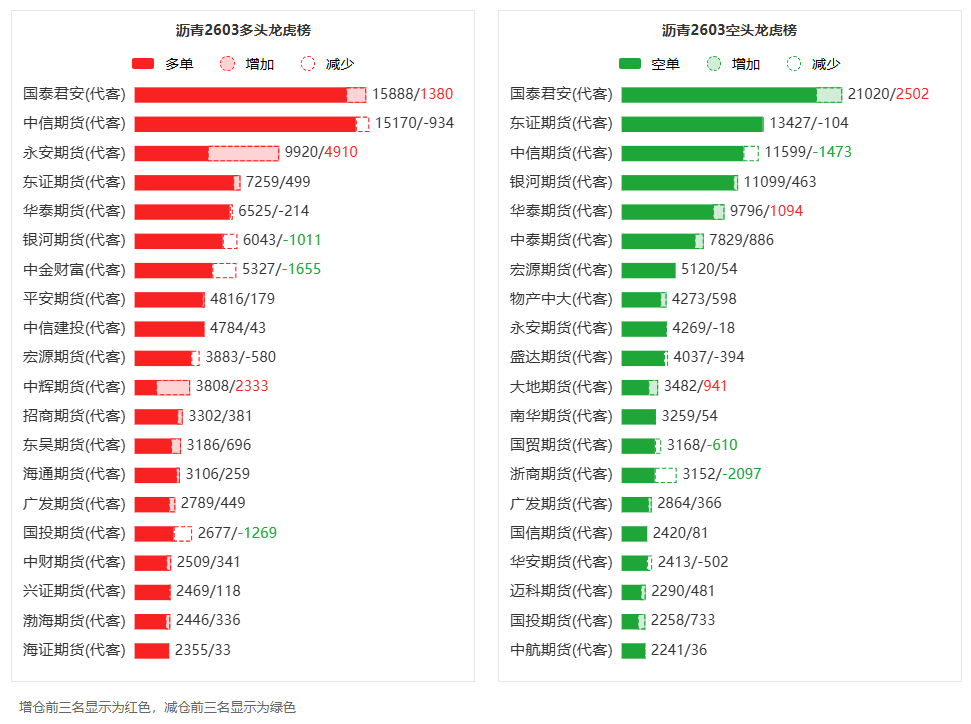 总体而言,沥青2603合约今日增仓上行,多空持仓排名前20席中,多空双方均呈进场态势,多头进场意愿强于空头。