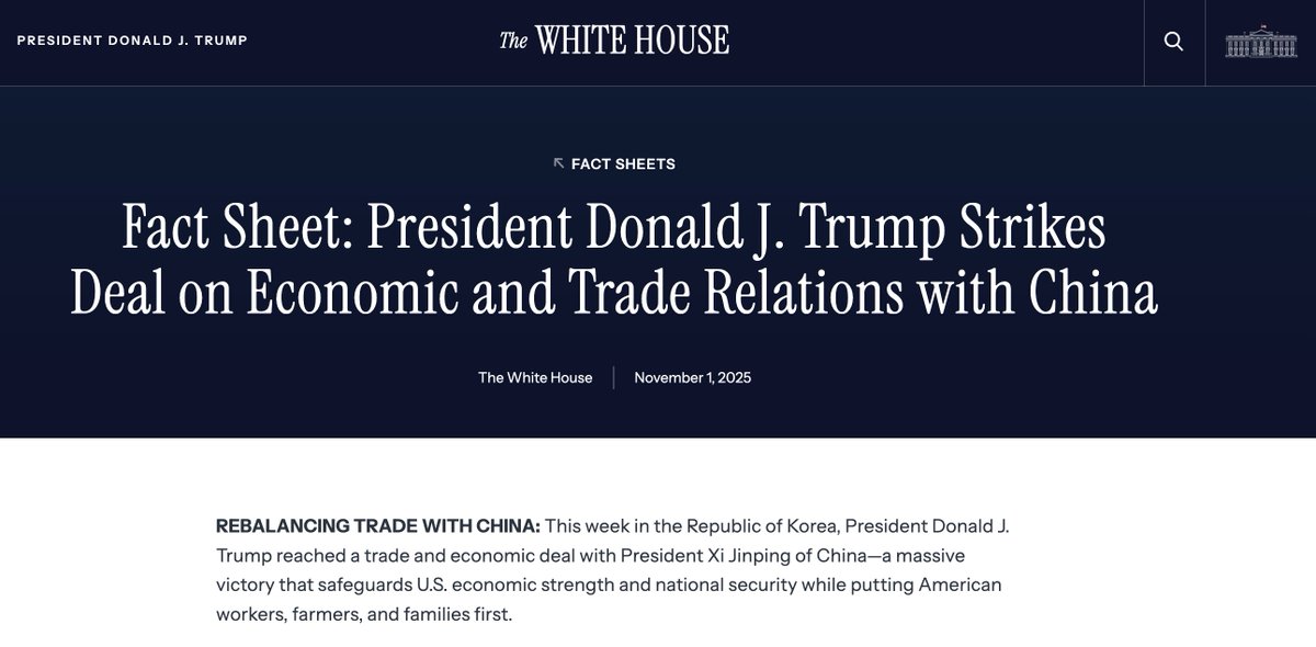 美国将从2025年11月10日起降低对中国进口商品为遏制芬太尼流入而征收的关税,累计税率将降低10个百分点,并将暂停对中国进口商品加征更高对等关税的政策延长至2026年11月10日(在此暂停期间,现行的10%对等关税将继续有效)。