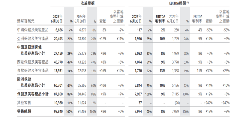 数据显示,保健及美容产品分部今年上半年的同比店铺销售额增长了4.5%,EBITDA(税息折旧及摊销前利润)以及EBIT(息税前利润)也均有改善,主要由欧洲及亚洲市场的理想表现推动,但中国市场略显乏力,中国保健及美容产品业务的同比店铺销售额录得1%的轻微跌幅。
