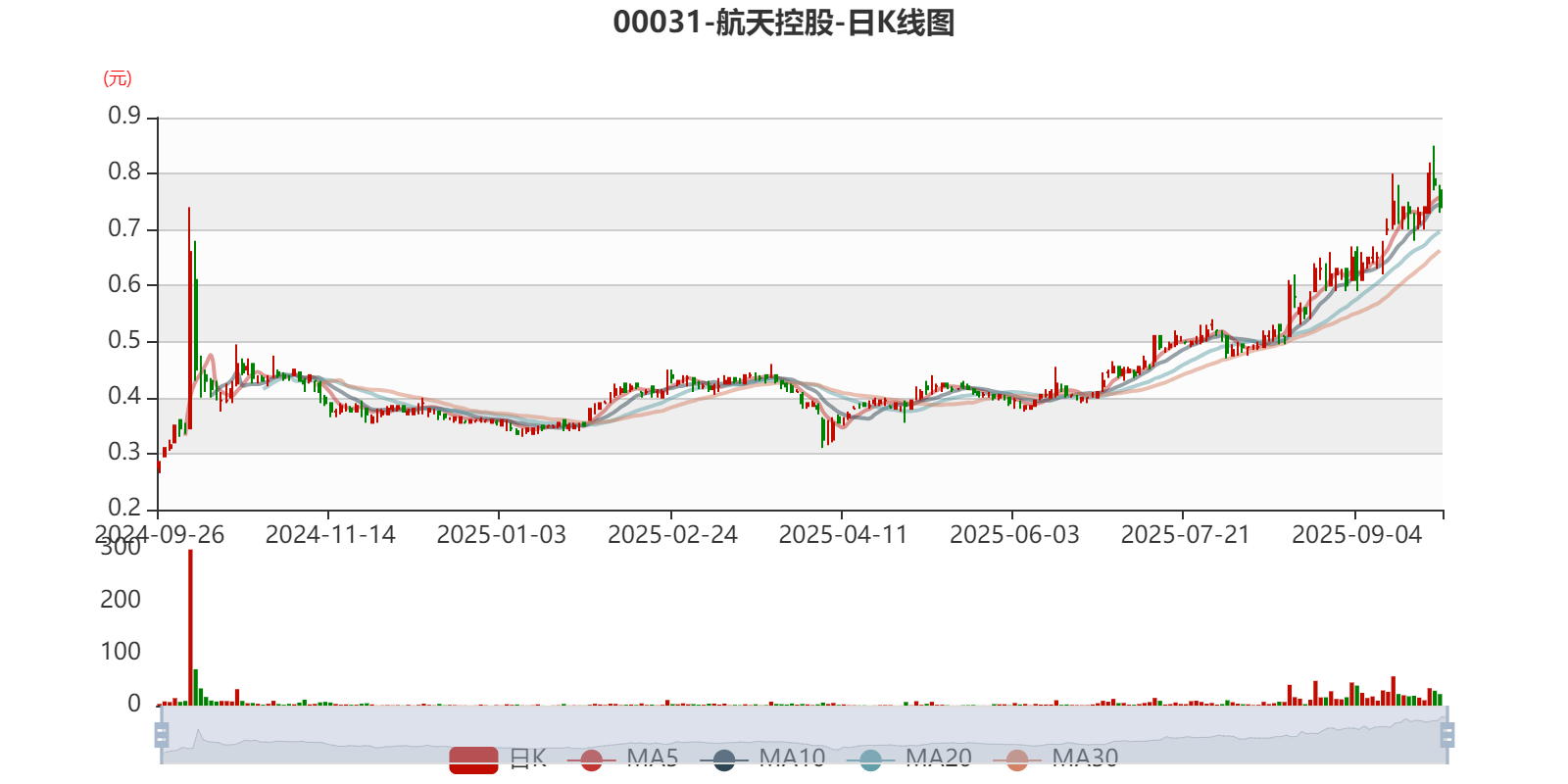 以9月26日收盘价计算,航天控股目前市净率(TTM)约0.31倍,市销率(TTM)约0.57倍。