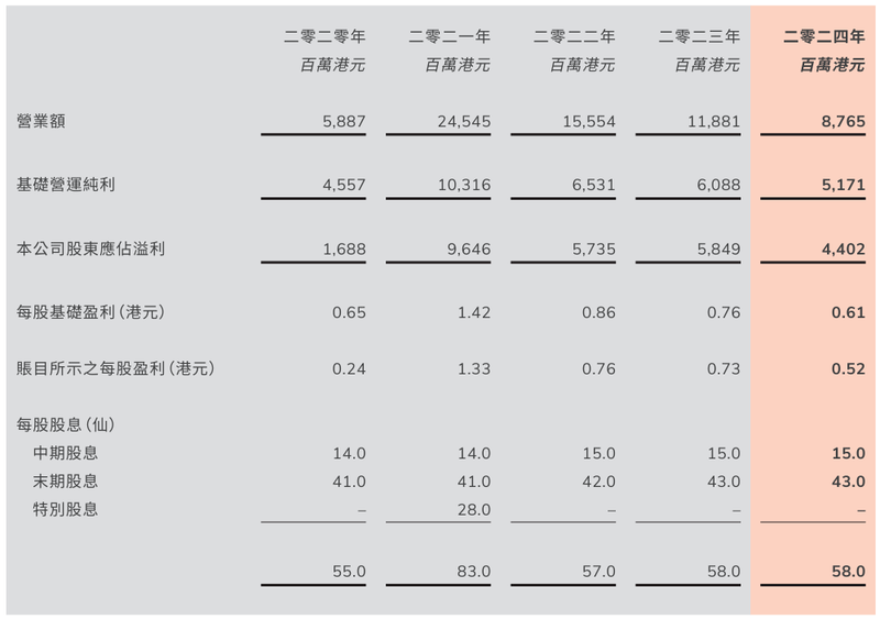 与此同时,信和置业的基础营运纯利也是连续三年下滑。2021年-2024年分别是103.16亿港元、65.31亿港元、60.88亿港元、51.71亿港元;股东应占溢利几乎同样的走势,2024年是44.02亿港元,相比2023年的58.49亿港元下降约24.7%。