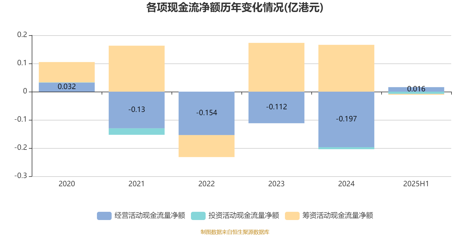 2025年上半年,公司经营活动现金流净额为161.4万港元;筹资活动现金流净额-26.1万港元;投资活动现金流净额-76.6万港元。
