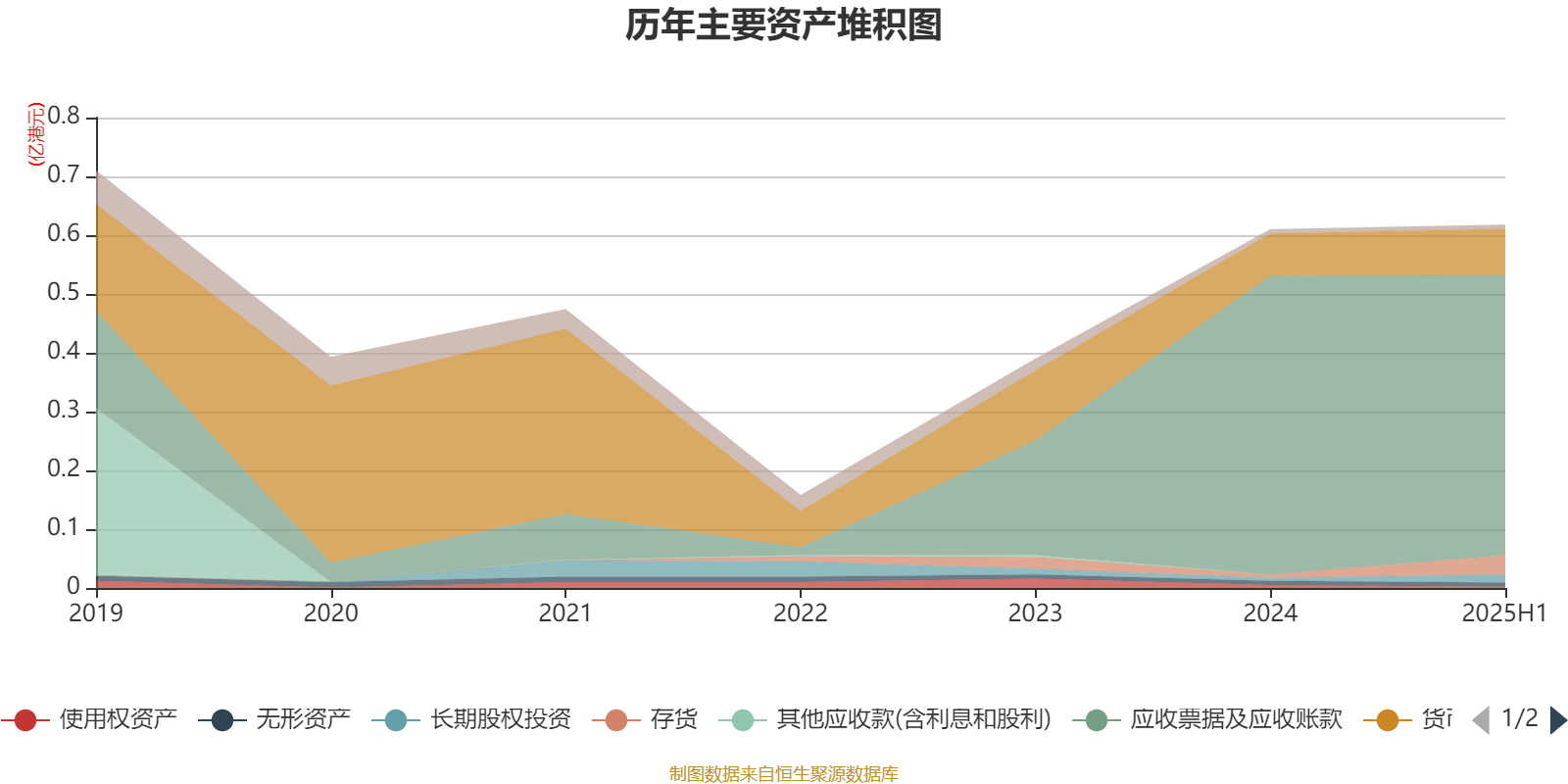 资产重大变化方面,截至2025年上半年,公司应收票据及应收账款较上期末减少6.46%,占公司总资产比重下降6.25个百分点;存货较上期末增加420.67%,占公司总资产比重上升4.28个百分点;长期股权投资较上期末增加165.22%,占公司总资产比重上升1.41个百分点;货币资金较上期末增加9.87%,占公司总资产比重上升1.02个百分点。