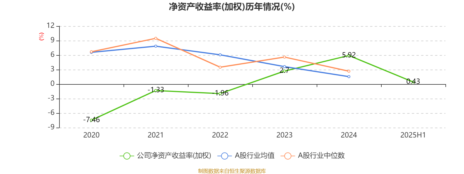 2025年上半年,公司平均净资产收益率为0.43%,较上年同期下降5.74个百分点。