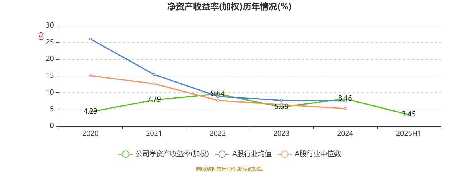 2025年上半年,公司平均净资产收益率为3.45%,较上年同期下降0.48个百分点。