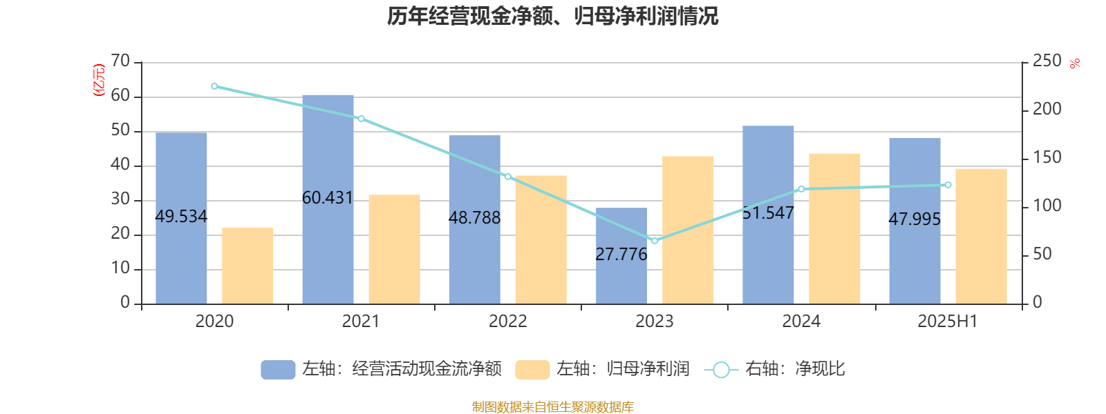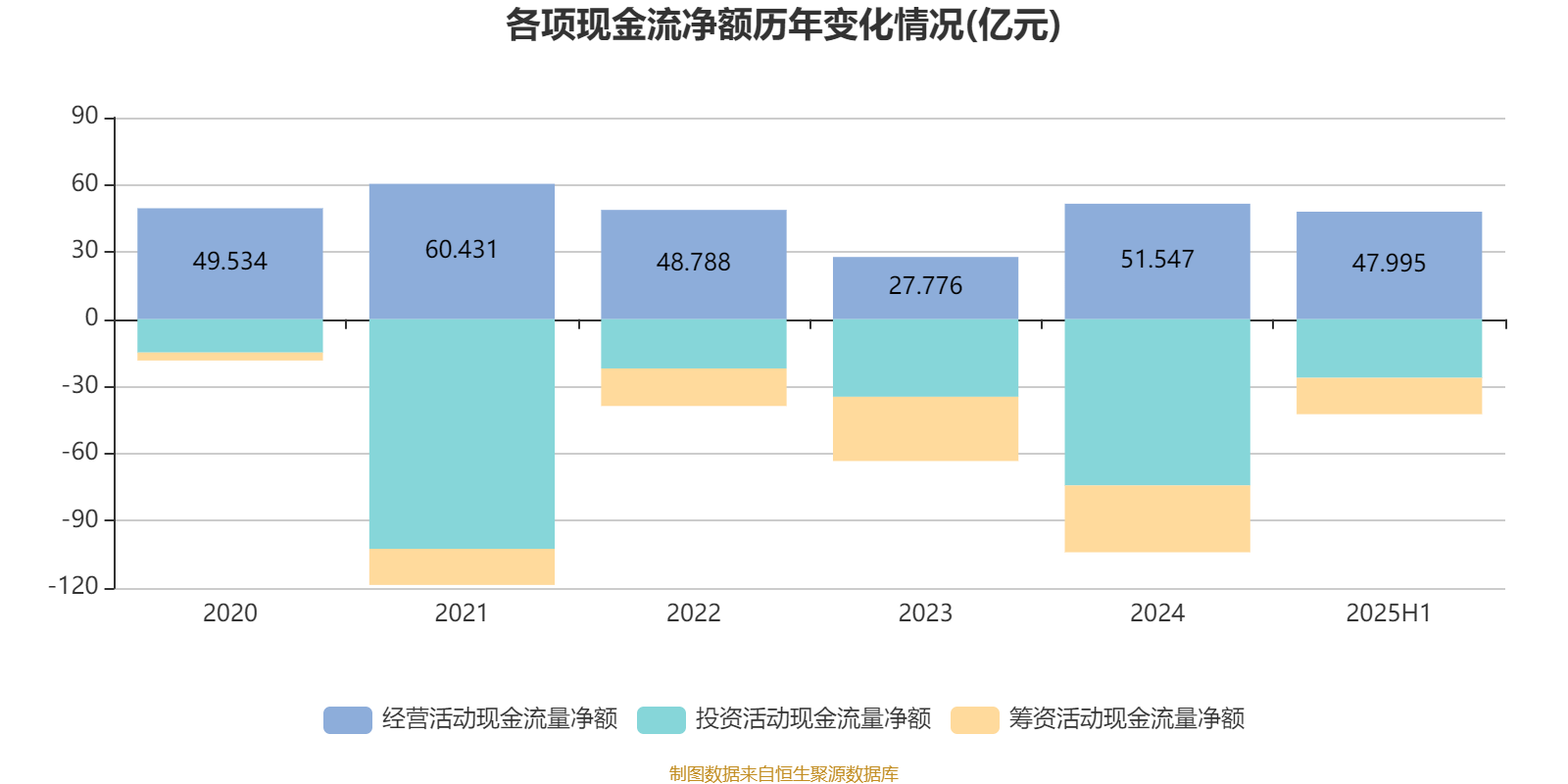 2025年上半年,公司经营活动现金流净额为48亿元;筹资活动现金流净额-16.24亿元;投资活动现金流净额-26.16亿元。