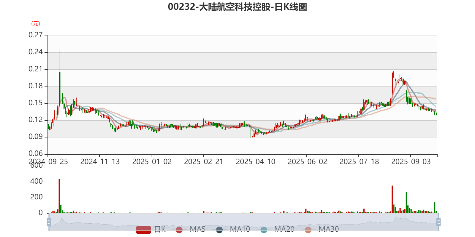 以9月25日收盘价计算,大陆航空科技控股目前市盈率(TTM)约10.68倍,市净率(TTM)约0.39倍,市销率(TTM)约0.6倍。