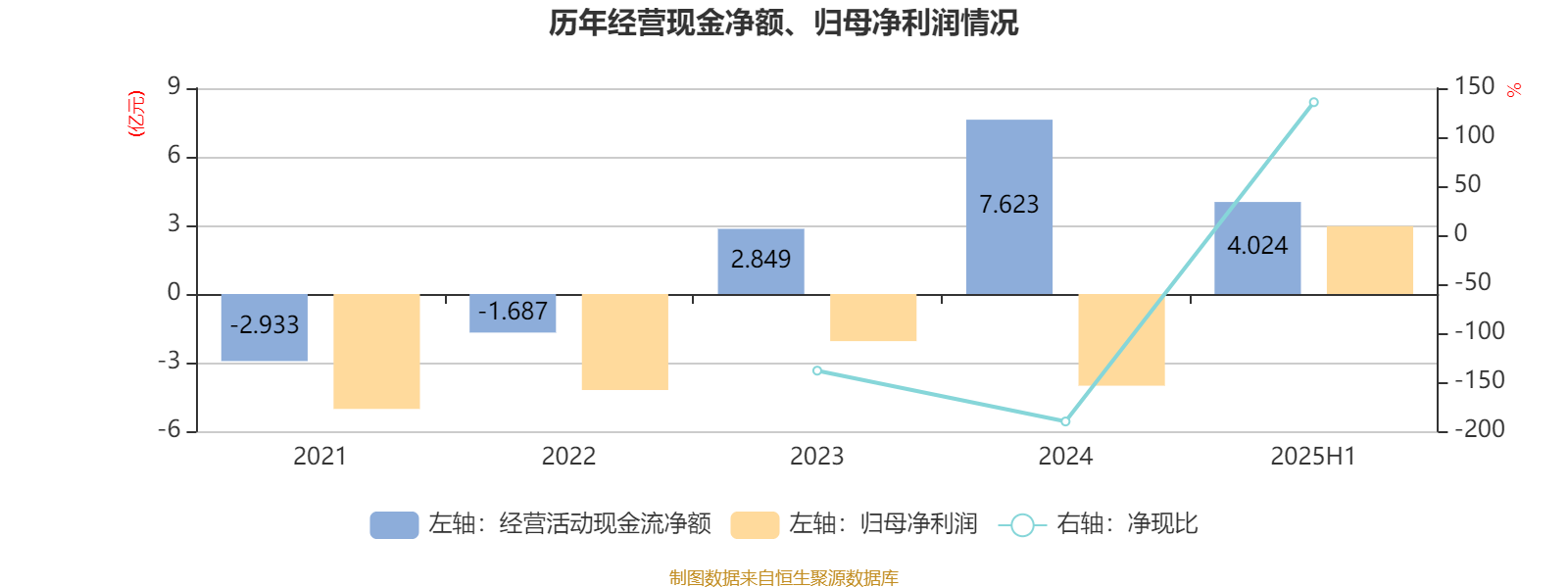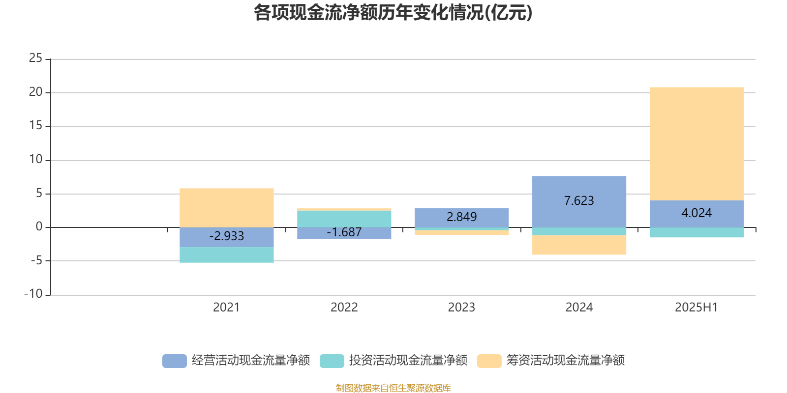 2025年上半年,公司经营活动现金流净额为4.02亿元;筹资活动现金流净额16.77亿元;投资活动现金流净额-1.49亿元。