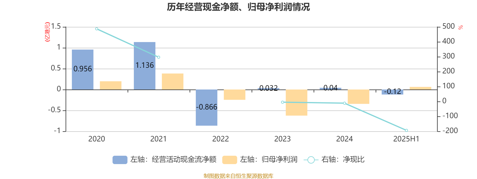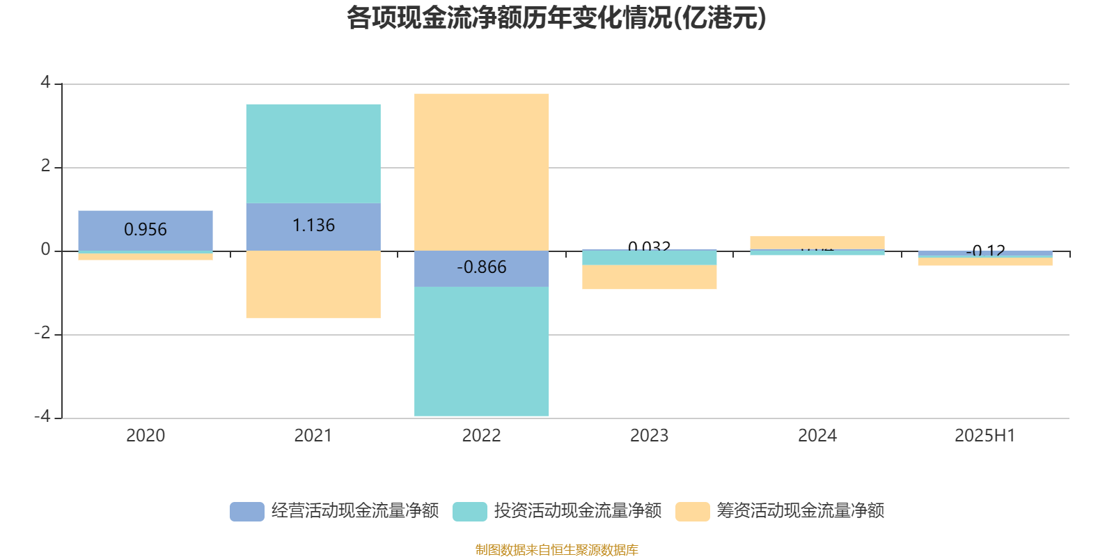2025年上半年,公司经营活动现金流净额为-1198.4万港元;筹资活动现金流净额-1893.4万港元;投资活动现金流净额-467.1万港元。