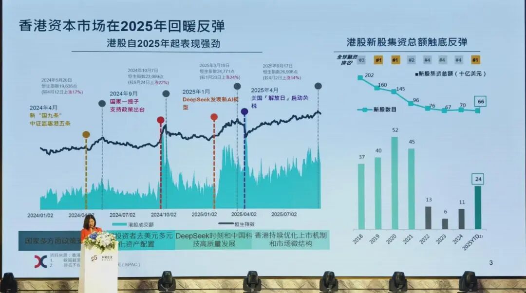 陈翊庭表示,自去年9月以来,在国内各项经济政策和科技创新成果的推动下,中国投资机遇再次赢得了全球投资者的关注。香港市场也在利好氛围中表现强劲,香港证券市场、衍生品市场以及沪深港通的成交量均创半年新高,新股市场的融资额重回全球交易所榜首,彰显了香港市场的活力与韧性。