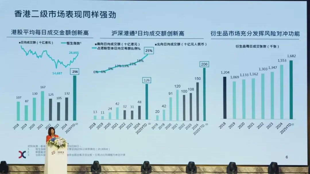 陈翊庭表示,上半年沪深股通和港股通平均每日成交金额均创新高。截至9月底,沪股通和深股通的日均成交额达到人民币2064亿元,同比上升68%。而港股通的日均成交额达到1260亿港元,是2024年的两倍以上。互联互通机制已成为推动中国资本市场双向开放的重要桥梁。