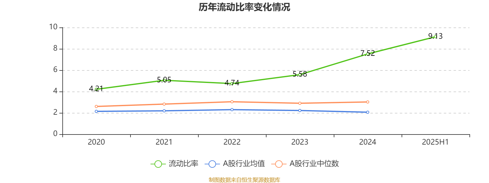 2025年上半年,公司流动比率为9.13。