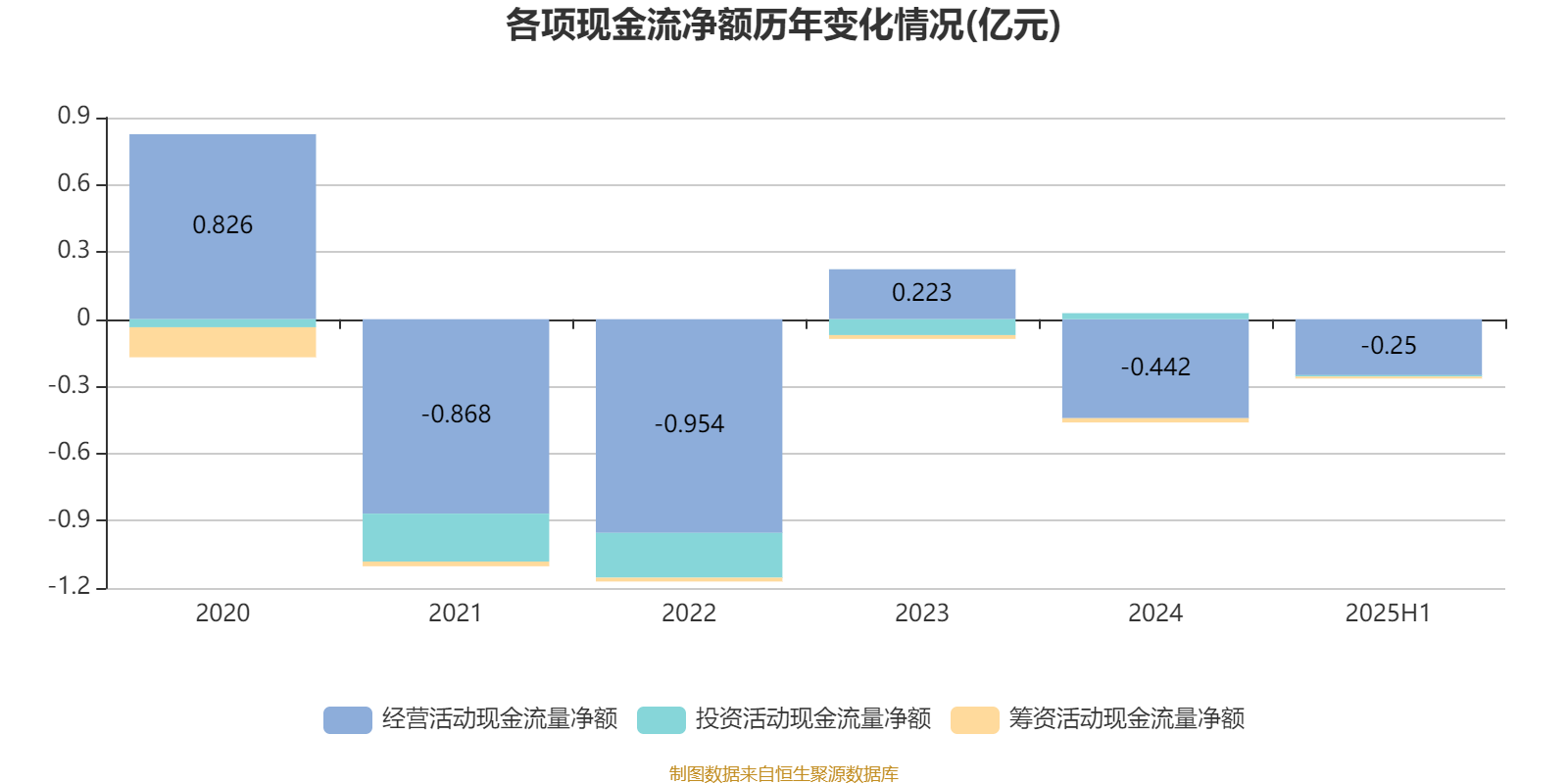2025年上半年,公司经营活动现金流净额为-2500.8万元;筹资活动现金流净额-94.7万元;投资活动现金流净额-62.4万元。