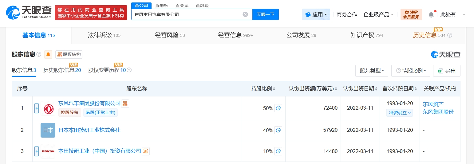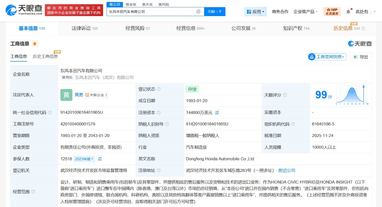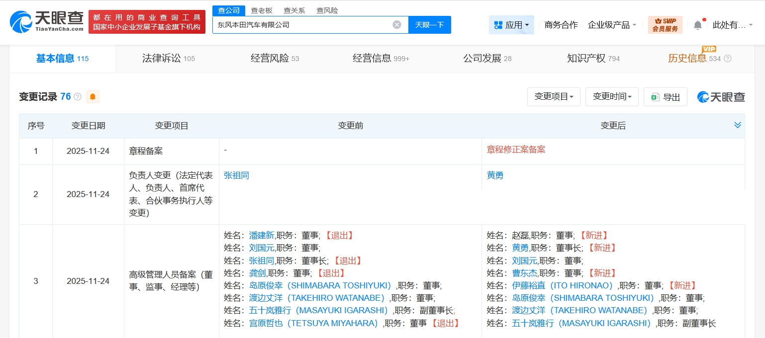 每经AI快讯,天眼查App显示,近日,东风本田汽车有限公司发生工商变更,张祖同卸任法定代表人、董事长,由黄勇接任,同时多位高管均发生变更。该公司成立于1993年1月,注册资本14.48亿美元,经营范围含设计、研制、制造和销售乘用车及其零部件,并提供相应的售后服务以及货物和技术的进出口业务等。股东信息显示,该公司由东风汽车集团股份有限公司、日本本田技研工业株式会社、本田技研工业(中国)投资有限公司共同持股。