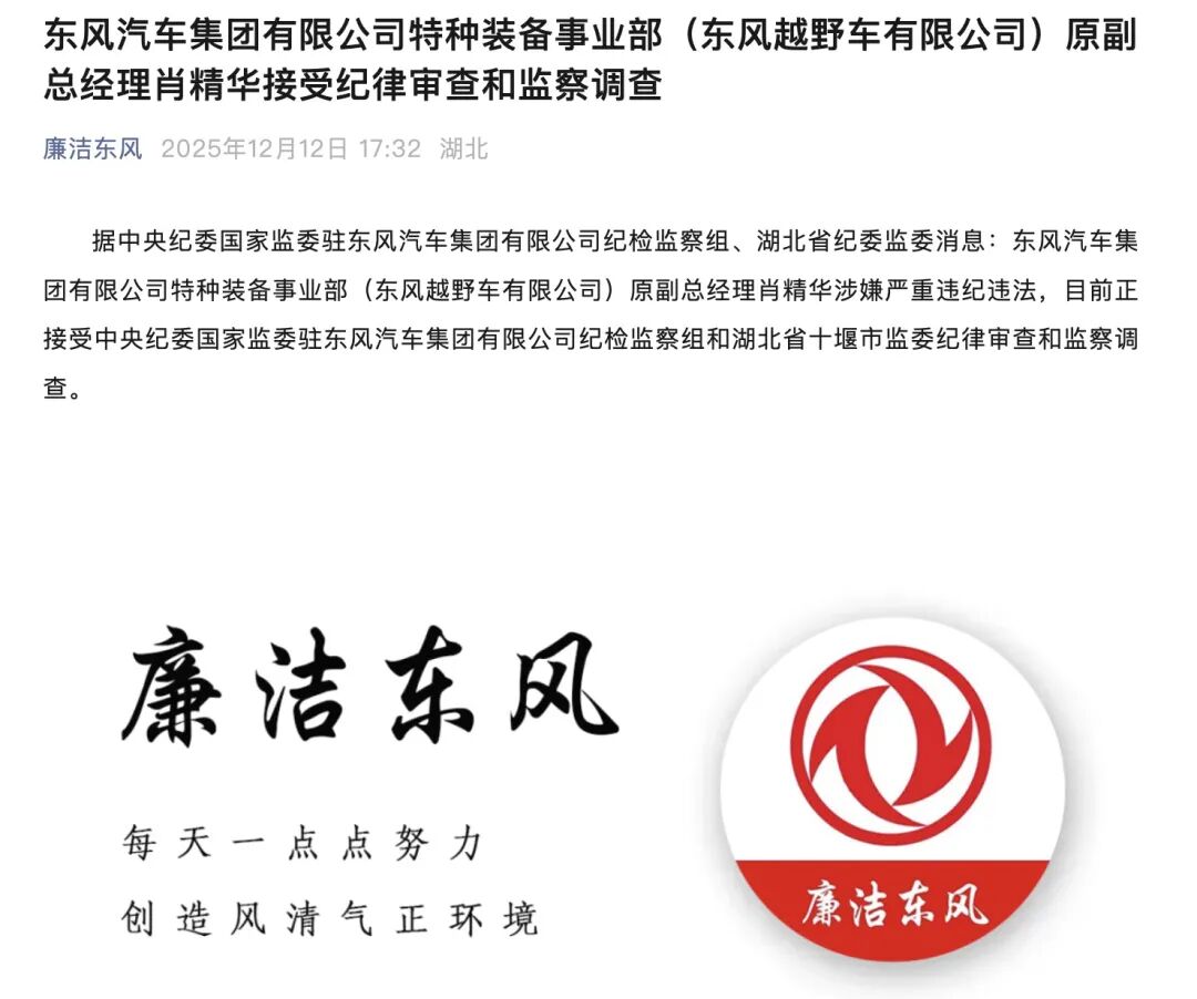 近日,根据中央纪委国家监委驻东风汽车集团有限公司纪检监察组、湖北省纪委监委消息,东风汽车集团有限公司特种装备事业部(东风越野车有限公司)原副总经理肖精华涉嫌严重违纪违法,正接受纪律审查和监察调查。