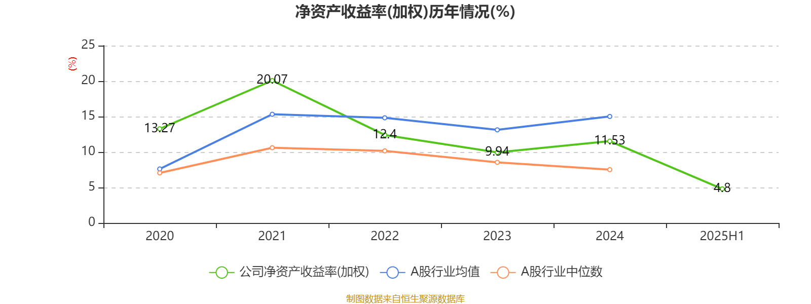2025年上半年,公司平均净资产收益率为4.8%,较上年同期下降2.14个百分点。