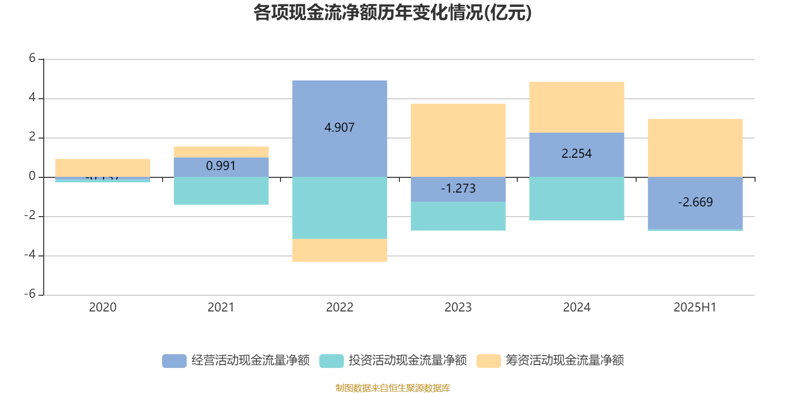 2025年上半年,公司经营活动现金流净额为-2.67亿元;筹资活动现金流净额2.95亿元;投资活动现金流净额-816.7万元。