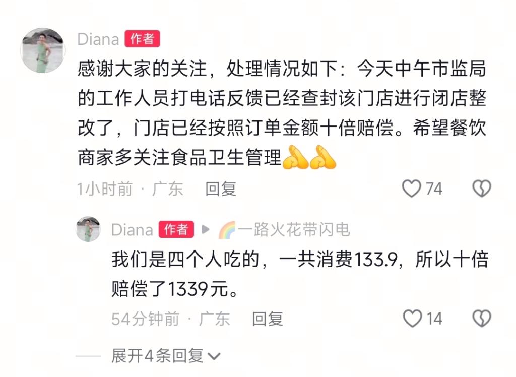 根据该用户后续回应,14日中午,“市监局的工作人员打电话反馈已经查封该门店进行闭店整改了,门店已经按照订单金额十倍赔偿。希望餐饮商家多关注食品卫生管理”。其在留言区还透露,当时是四个人一起吃饭,“一共消费133.9,十倍赔偿了1339元”。