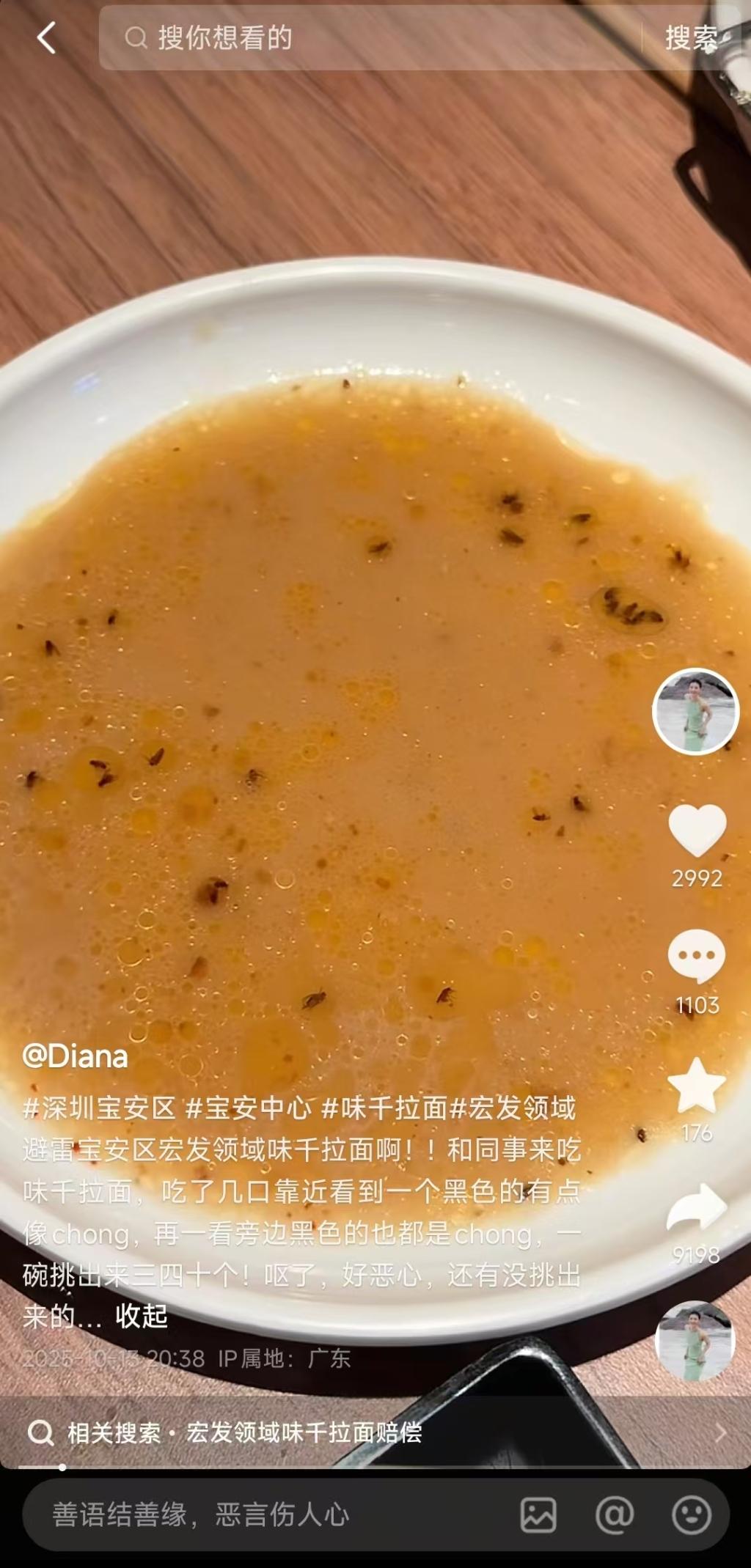 消费者发布在社交网站的视频显示,其在深圳宝安区创业一路某商场内的味千拉面店吃出大量虫子。店长表示虫是醋里的,其他加醋的食客也发现了虫,门店表示会退款处理,自己则拨打了12315热线反映此事。