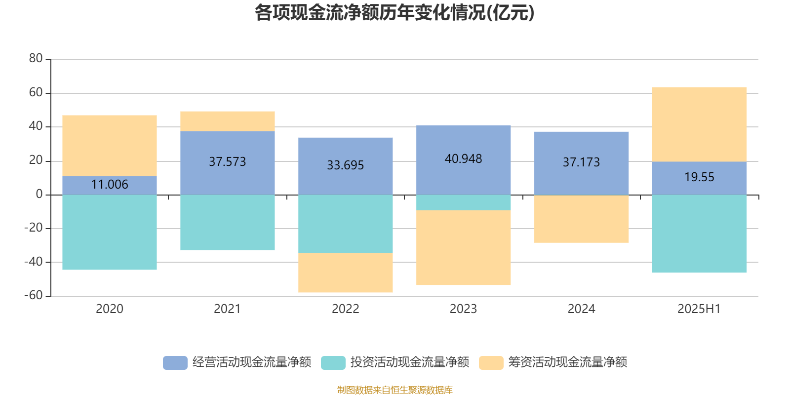 2025年上半年,公司经营活动现金流净额为19.55亿元;筹资活动现金流净额43.91亿元;投资活动现金流净额-46亿元。