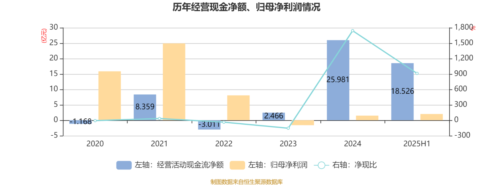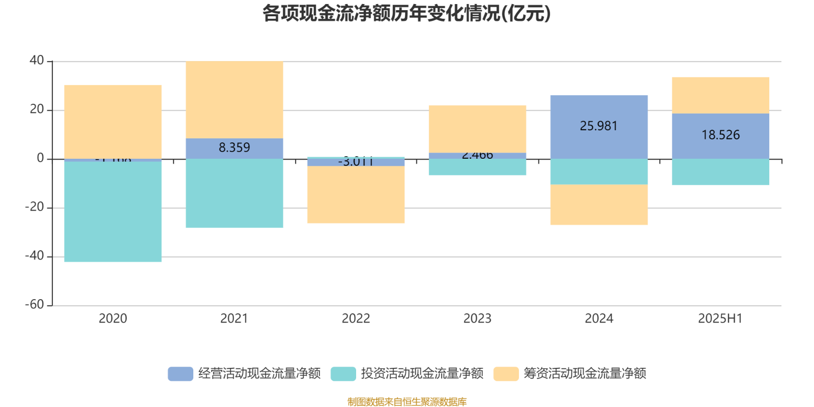2025年上半年,公司经营活动现金流净额为18.53亿元;筹资活动现金流净额14.86亿元;投资活动现金流净额-10.78亿元。
