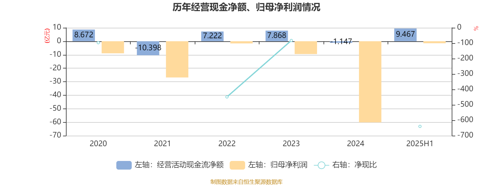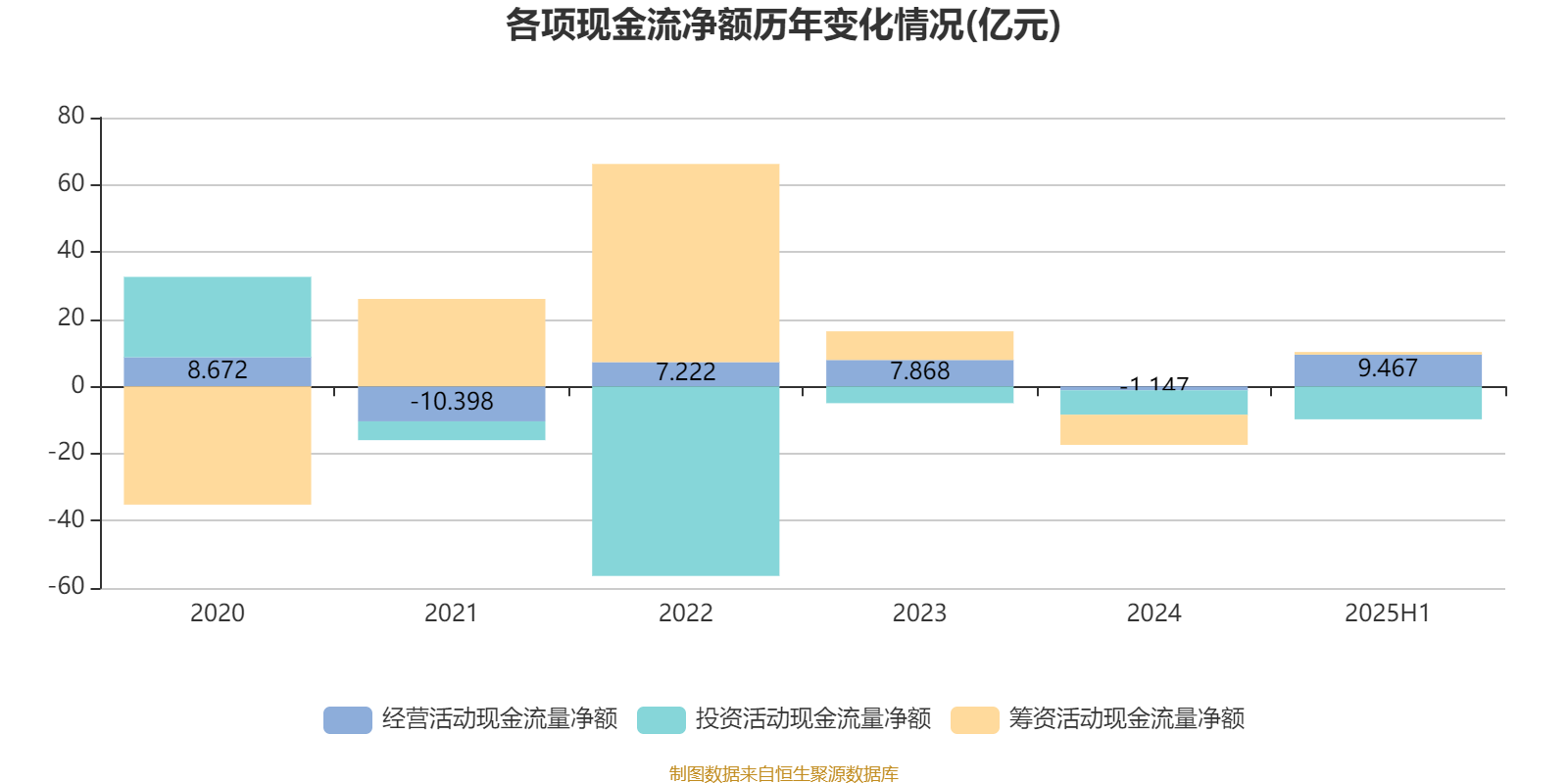 2025年上半年,公司经营活动现金流净额为9.47亿元;筹资活动现金流净额7767.4万元;投资活动现金流净额-9.79亿元。