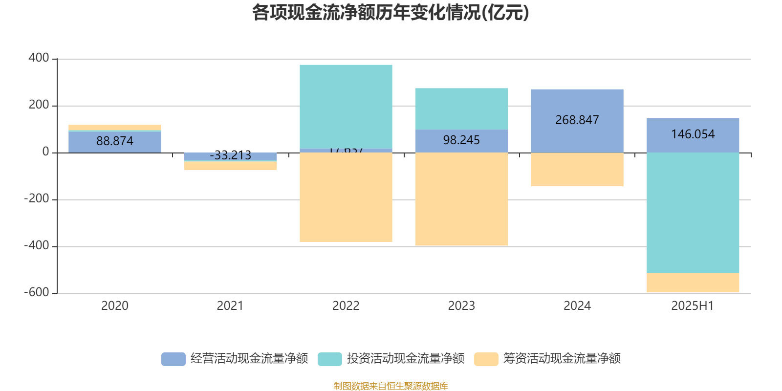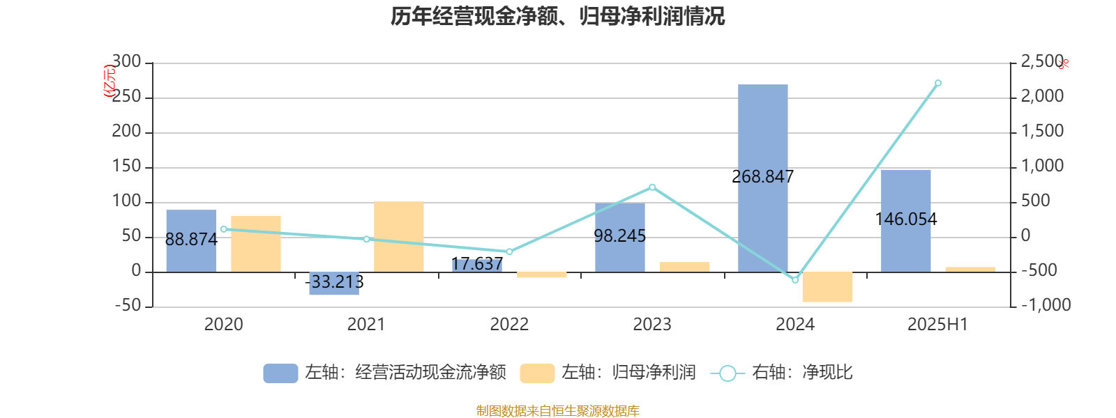 2025年上半年,公司经营活动现金流净额为146.05亿元;筹资活动现金流净额-81.53亿元;投资活动现金流净额-514.48亿元。