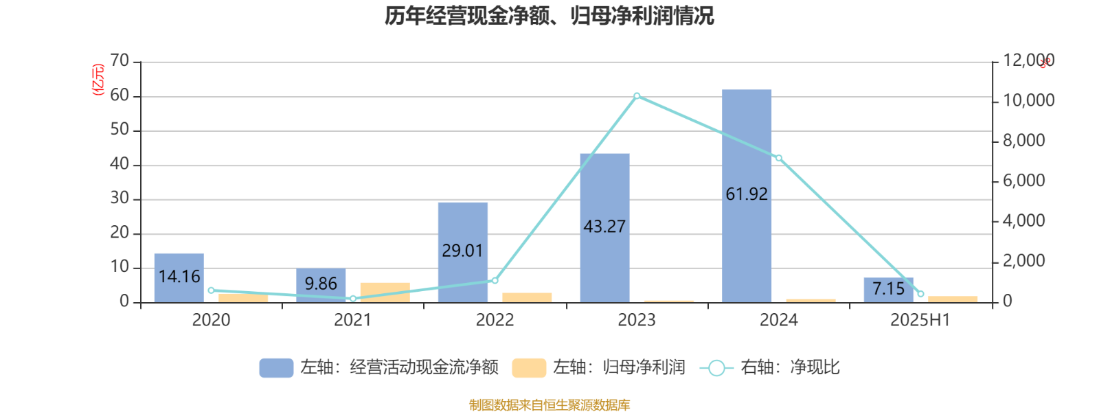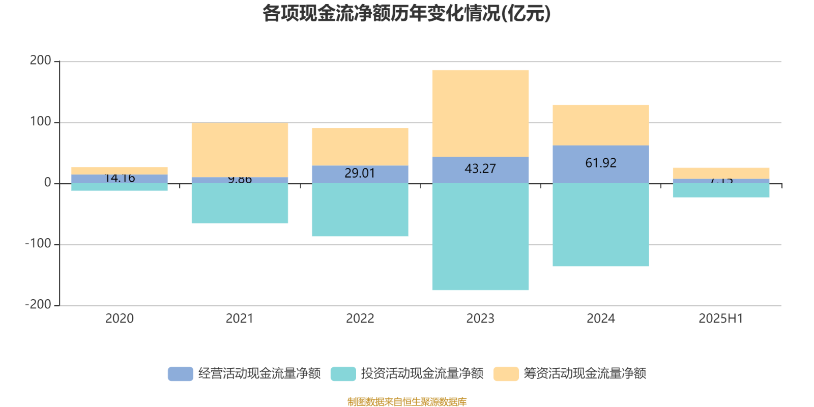 2025年上半年,公司经营活动现金流净额为7.15亿元;筹资活动现金流净额18.02亿元;投资活动现金流净额-23.41亿元。