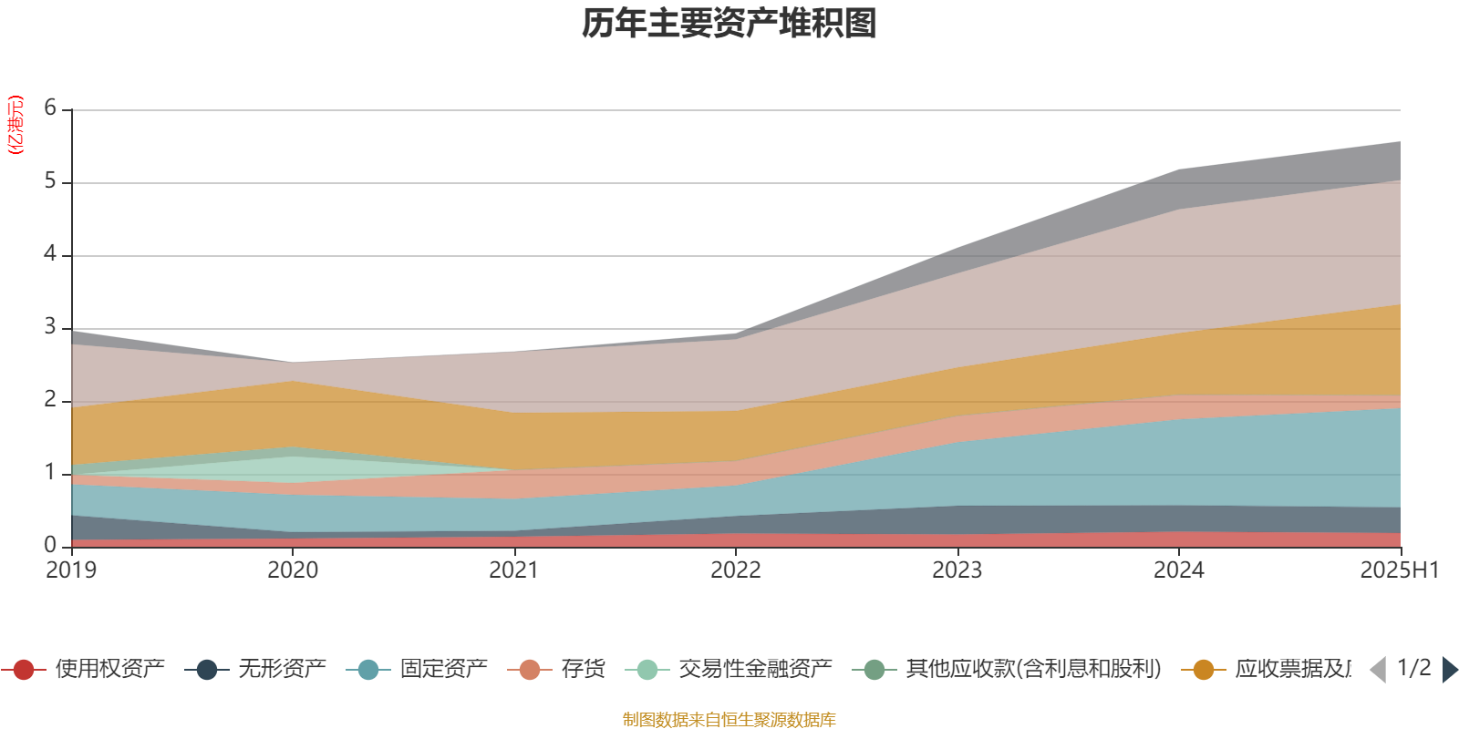 资产重大变化方面,截至2025年上半年,公司应收票据及应收账款较上期末增加47.44%,占公司总资产比重上升6.07个百分点;存货较上期末减少46.89%,占公司总资产比重下降3.3个百分点;货币资金较上期末增加0.37%,占公司总资产比重下降2.16个百分点;固定资产较上期末增加15.25%,占公司总资产比重上升1.66个百分点。