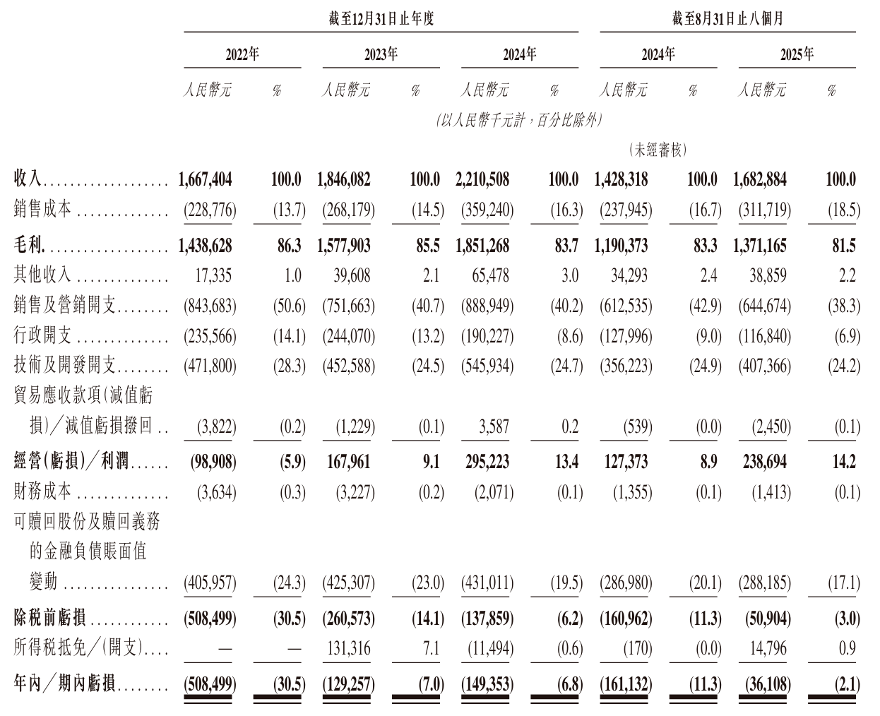 招股书显示,2022年至2024年,Soul营收分别为16.67亿元、18.46亿元、22.11亿元;毛利分别为14.39亿元、15.78亿元、18.51亿元;毛利率分别为86.3%、85.5%、83.7%;经调整净利分别为-2190万元、3.61亿元、3.37亿元。