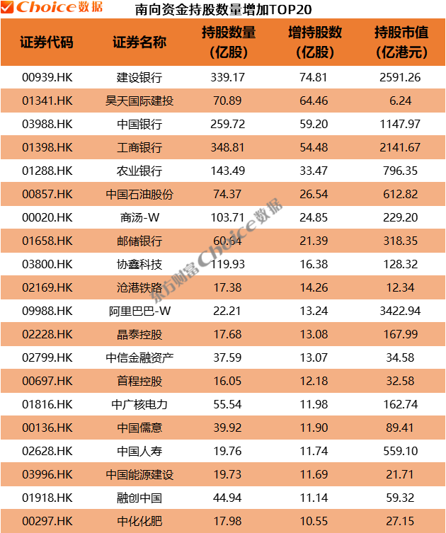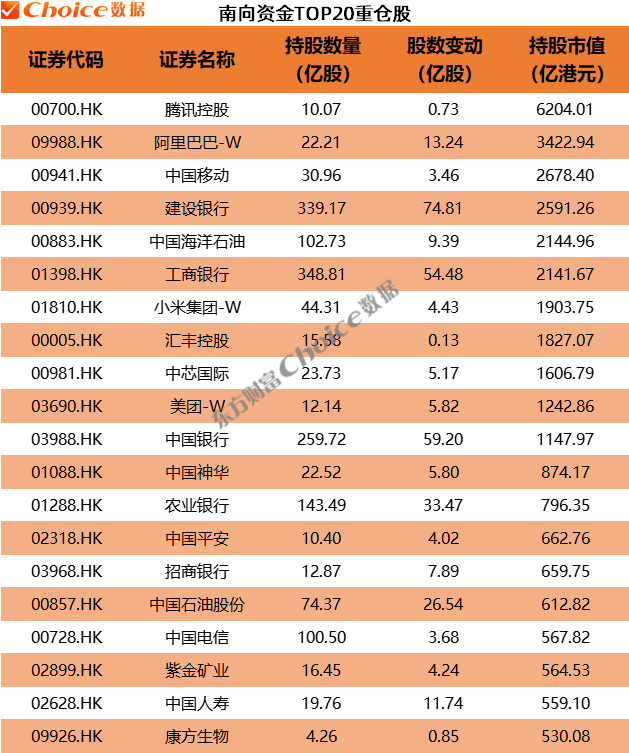 前20大重仓股中,相较年初,南向资金对腾讯控股加仓了0.73亿股,加仓阿里巴巴13.24亿股,加仓中国移动3.46亿股,建设银行、工商银行、中国银行加仓股数均超过50亿股。