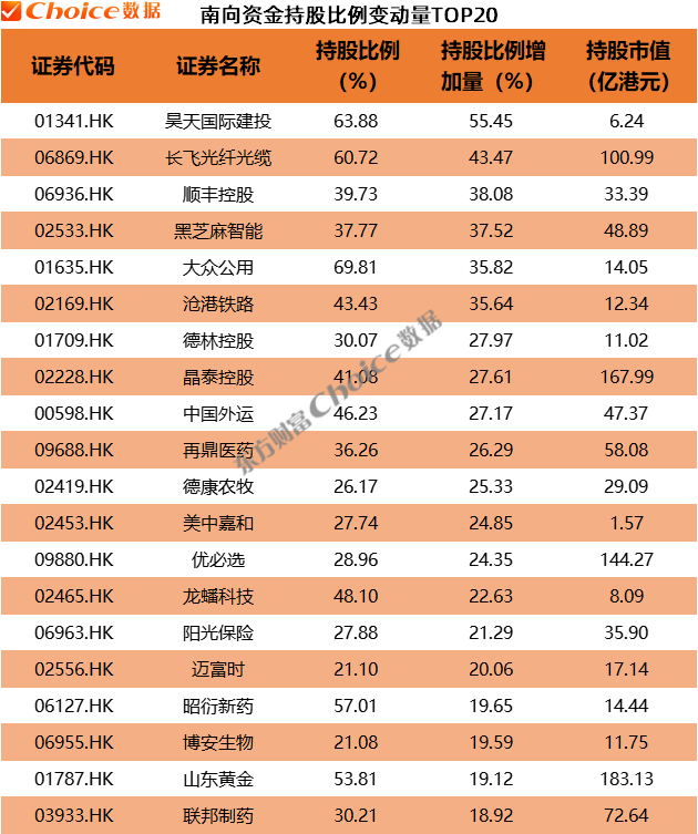 从持股占比变动量来看,年初以来,南向资金持有个股占该股股本比增加超20%的有16只。其中,昊天国际建设的持股比例增加最大,持股占比从年初的8.43%增加至63.88%,增加了55.45%,市值达6.24亿港元;排名第二的是长飞光纤光缆,增加比例为43.47%,市值达100.99亿港元;顺丰控股、黑芝麻智能、大众公用、沧港铁路持股比例分别增加38.08%、37.52%、35.82%、35.64%。