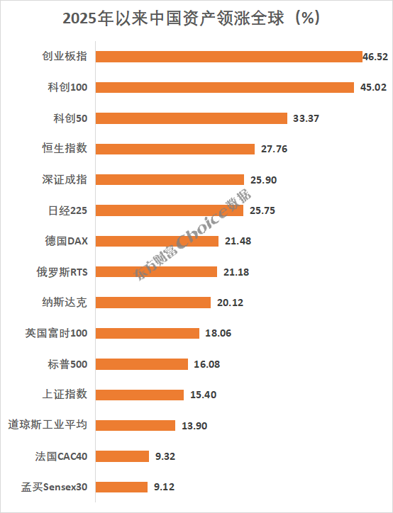 2025年以来,得益于全球宽松的流动性,权益资产大涨。其中,中国资产领涨全球资本市场。截至12月15日收盘,创业板指年内大涨46.52%,科创100上涨45.02%,恒生指数、深证成指涨超20%。