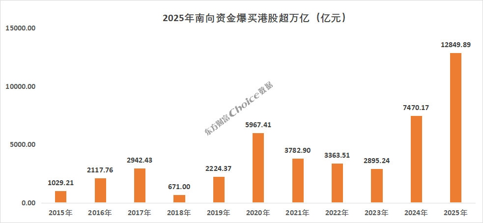 2025年,南向资金历史性买入港股,Choice数据显示,截至12月15日,南向资金年内累计净流入12849.89亿元,刷新新的历史纪录,已接近过去三年净流入总和。