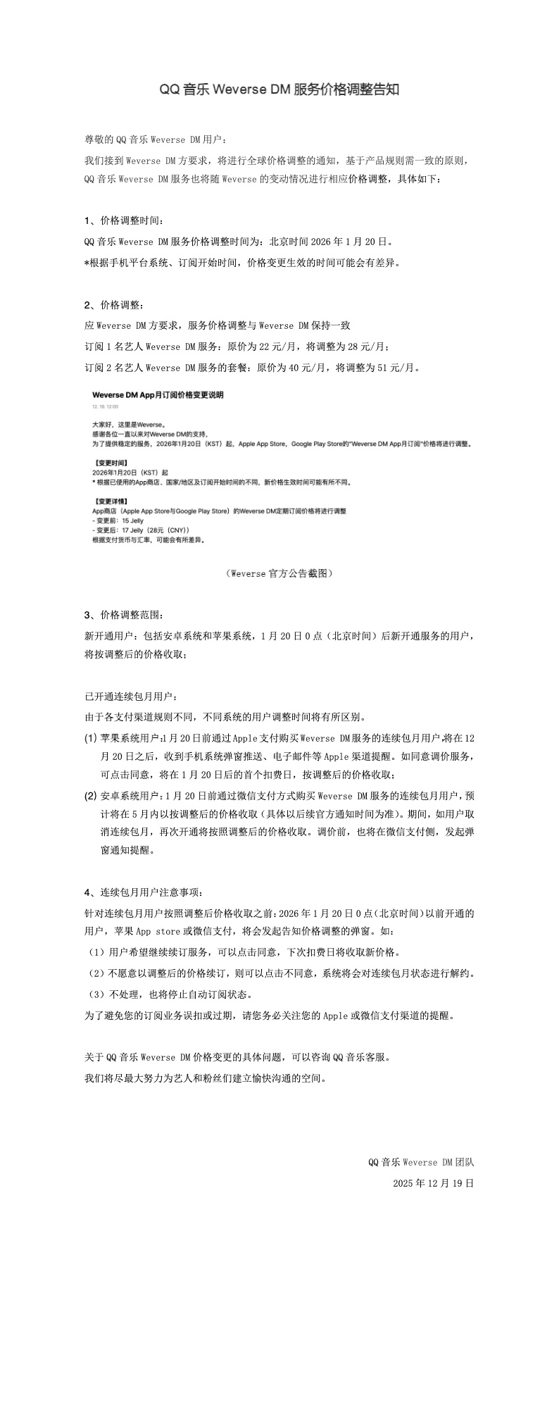 12月19日,QQ音乐发布公告称,QQ音乐Weverse DM服务将随Weverse的变动情况进行相应价格调整,价格调整时间为北京时间2026年1月20日。应Weverse DM方要求,服务价格调整与Weverse DM保持一致:订阅1名艺人Weverse DM服务原价为22元/月,将调整为28元/月;订阅2名艺人Weverse DM服务的套餐原价为40元/月,将调整为51元/月。