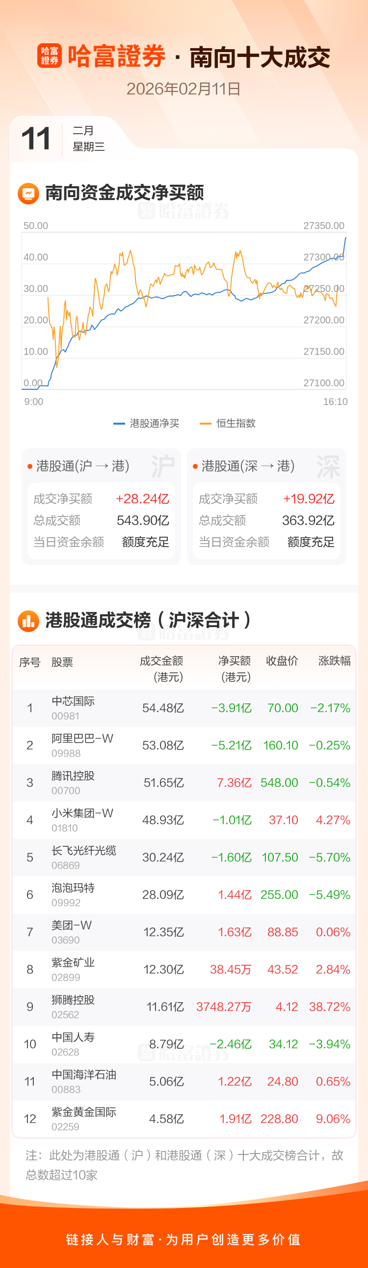 恒生指数2月11日涨0.31%,收报27266.38点。南向资金今日净买入港股48.16亿港元。南向资金今日成交额907.82亿港元,港股大市成交2172.18亿港元。