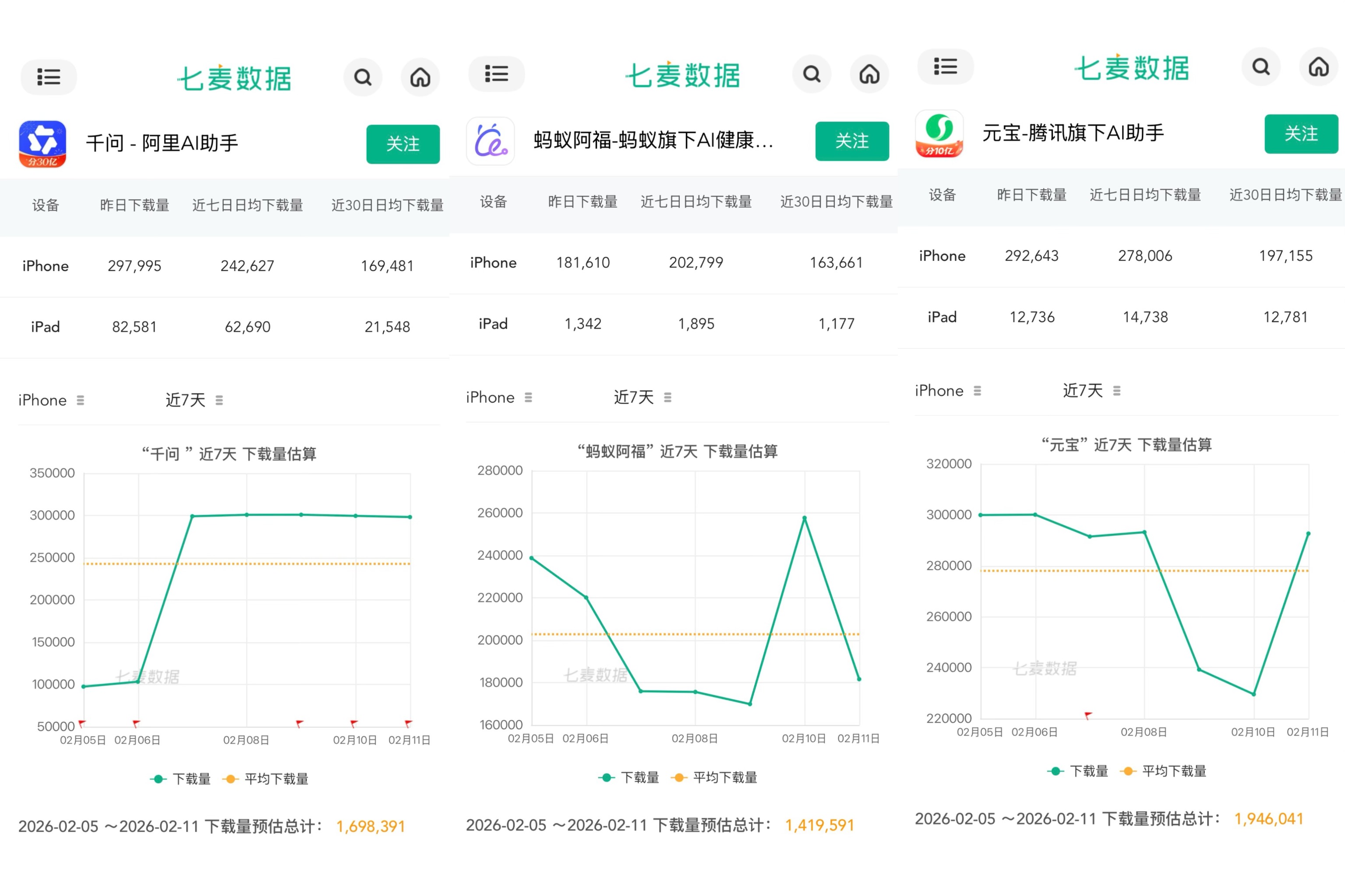 下载量方面,千问近7日(2月5日至2月11日)iPhone端日均下载量预估超过24.2万,蚂蚁阿福超过20.2万,元宝则超过27.8万。(完)