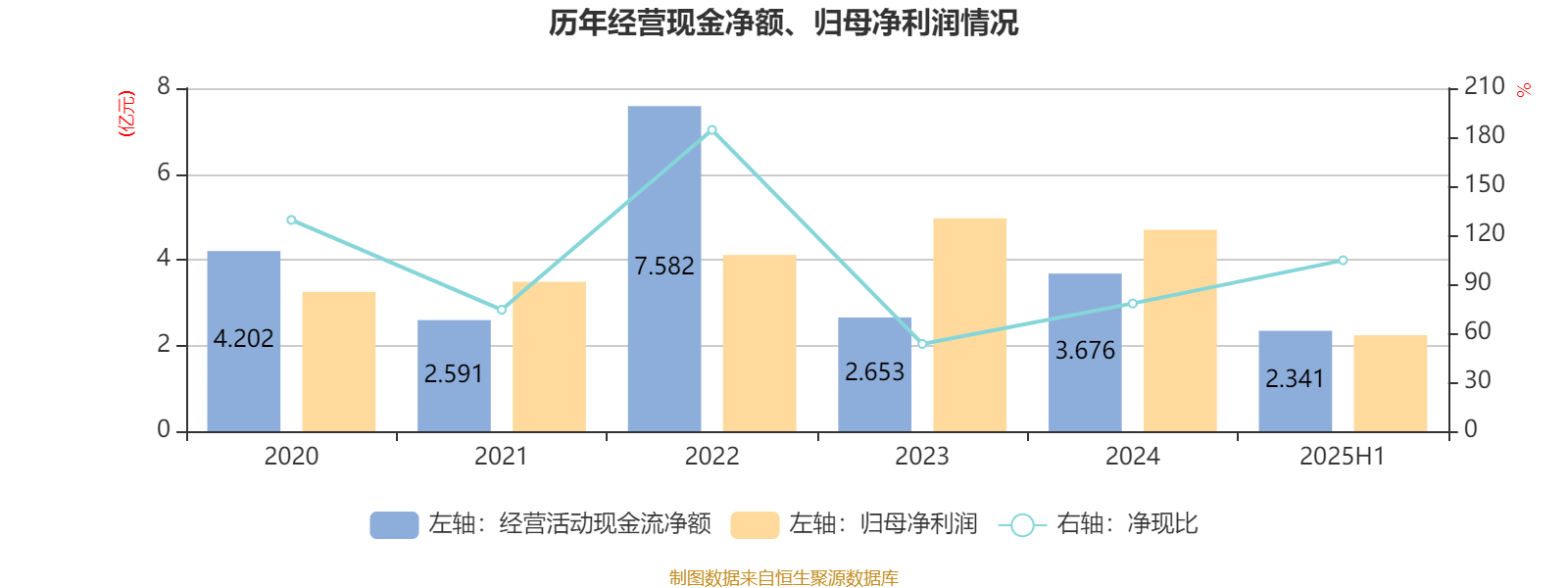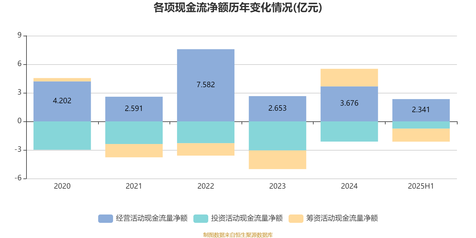 2025年上半年,公司经营活动现金流净额为2.34亿元;筹资活动现金流净额-1.37亿元;投资活动现金流净额-7623.95万元。