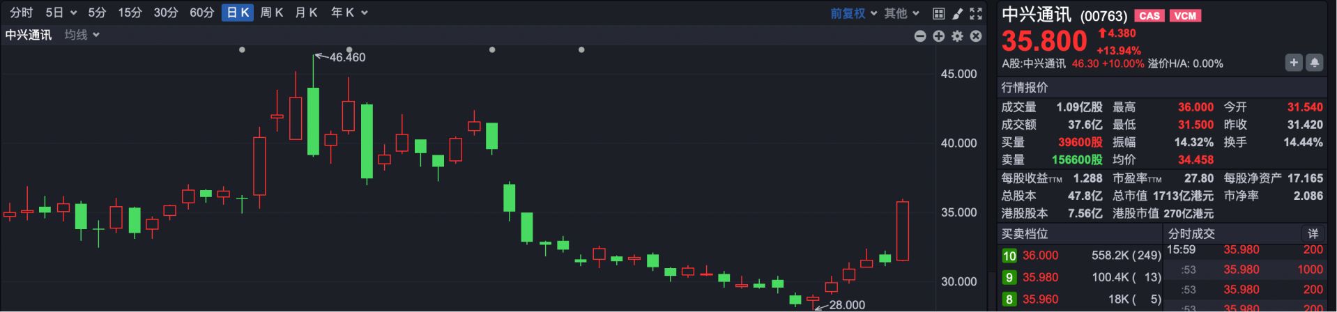 焦点公司方面,中兴通讯H股(HK00763)涨超13%,同时中兴通讯A股迎来10%涨停板。