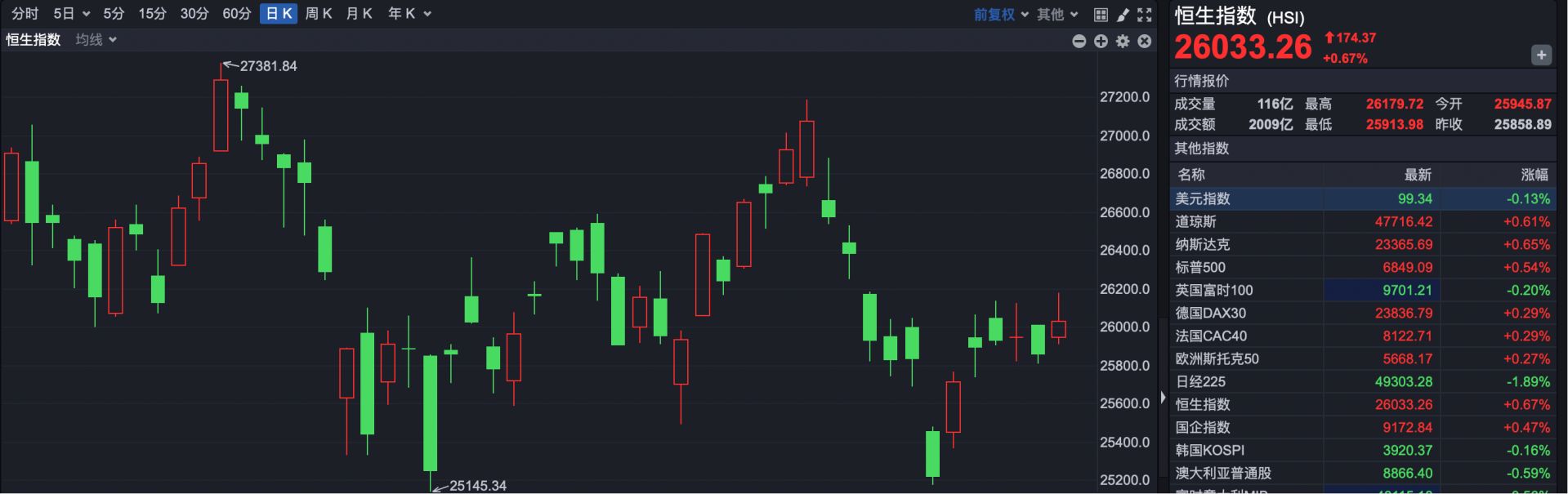 截至收盘,恒生指数报收于26033.26点,上涨174.37点,涨幅0.67%。