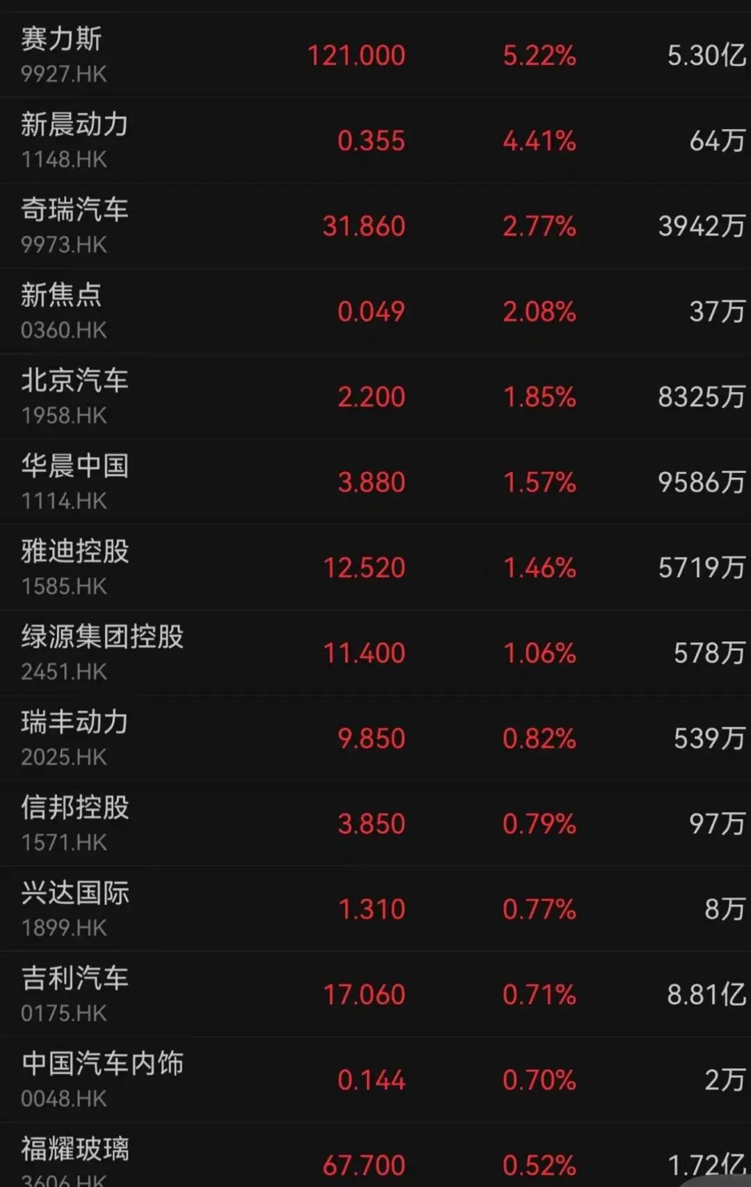 赛力斯今日早盘涨超8%,最终收涨5.22%。汽车股集体走高,北京汽车、华晨中国、吉利汽车等分别上涨1.85%、1.57%、0.71%。
