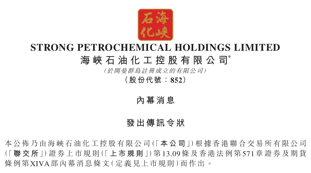 公开资料显示,海峡石油化工控股有限公司成立于2008年,位于香港特别行政区,企业注册资本1亿港元。公司主要从事石油产品贸易业务,还通过子公司提供汽油及柴油的存储服务。