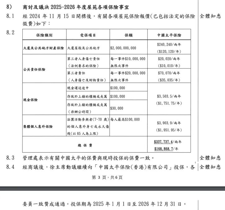 2024年12月18日,宏福苑业主立案法团召开第十二届管理委员会第8次全体委员会,其中一项议程为“商讨及议决2025—2026年度屋苑各项保险事宜”。会议记录显示,经商议后,动议继续向中国太平保险(香港)有限公司投保,各委员一致赞成通过,投保期为2025年1月1日至2026年12月31日。