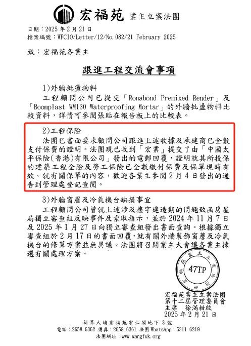 《国际金融报》记者在宏福苑业主立案法团网站注意到,今年2月21日发布的一份《跟进工程交流会事项》文件显示,针对工程保险事项,法团已收到宏业建筑工程有限公司提交的由中国太平保险(香港)有限公司发出的电邮回复,证明就其所投保的建筑工程全险及劳工保险已全数缴付保单及保单现时有效。