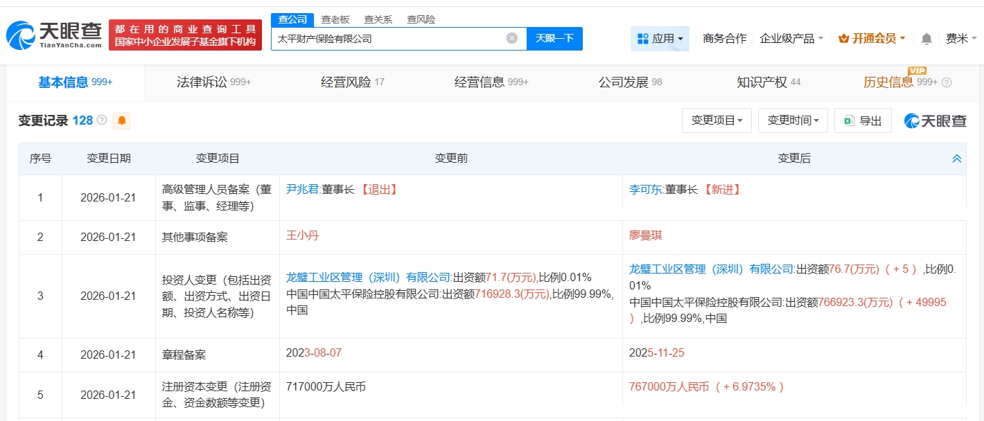 每经AI快讯,天眼查App显示,近日,太平财产保险有限公司发生工商变更,注册资本由71.7亿元人民币增至76.7亿元人民币,增幅约7%,同时,尹兆君卸任董事长,由李可东接任。该公司成立于1982年2月,法定代表人为朱捷,经营范围包括财产损失保险、责任保险、信用保险和保证保险等人民币或外币保险业务等,由中国太平保险控股有限公司、龙璧工业区管理(深圳)有限公司共同持股。