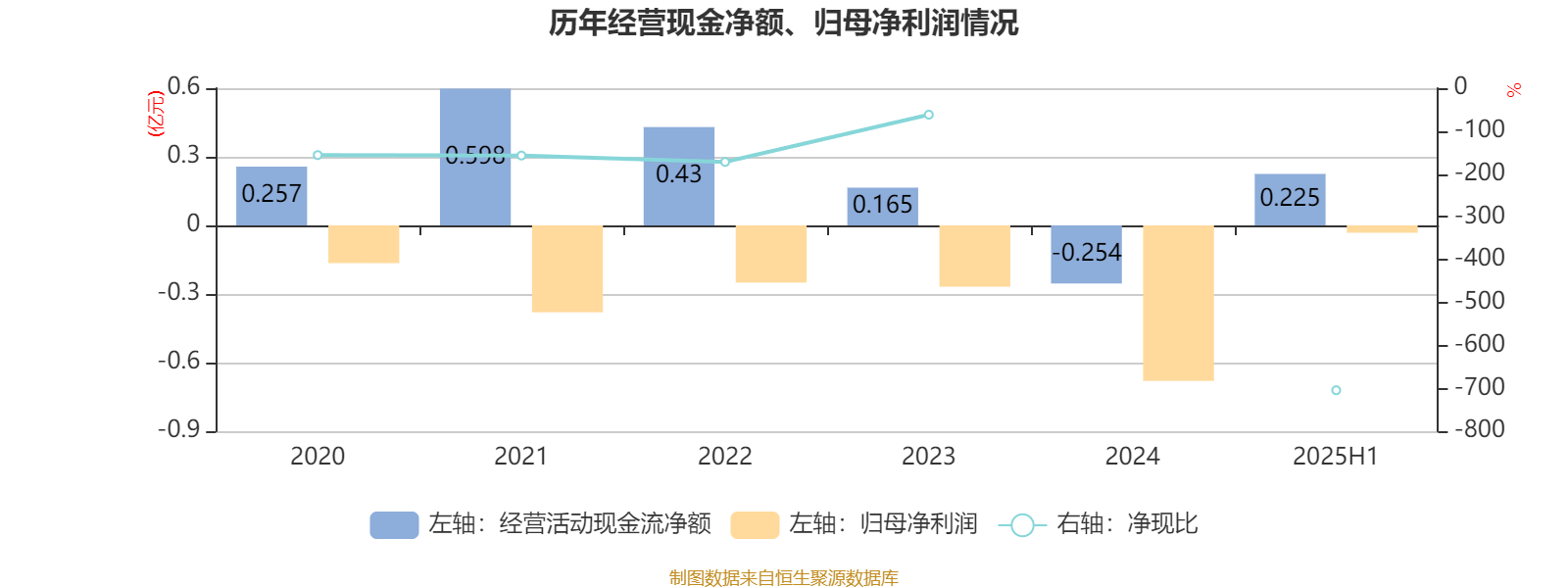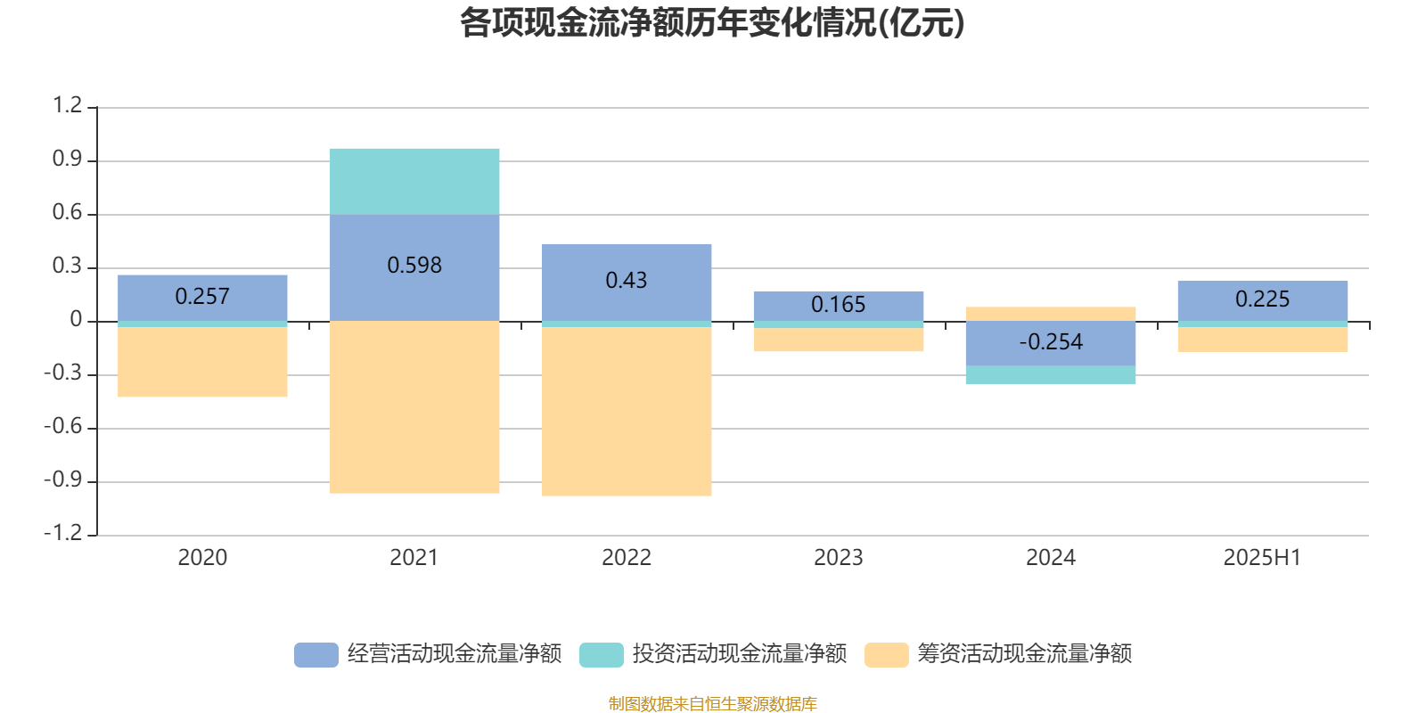 2025年上半年,公司经营活动现金流净额为2254.4万元;筹资活动现金流净额-1391.2万元;投资活动现金流净额-361.3万元。